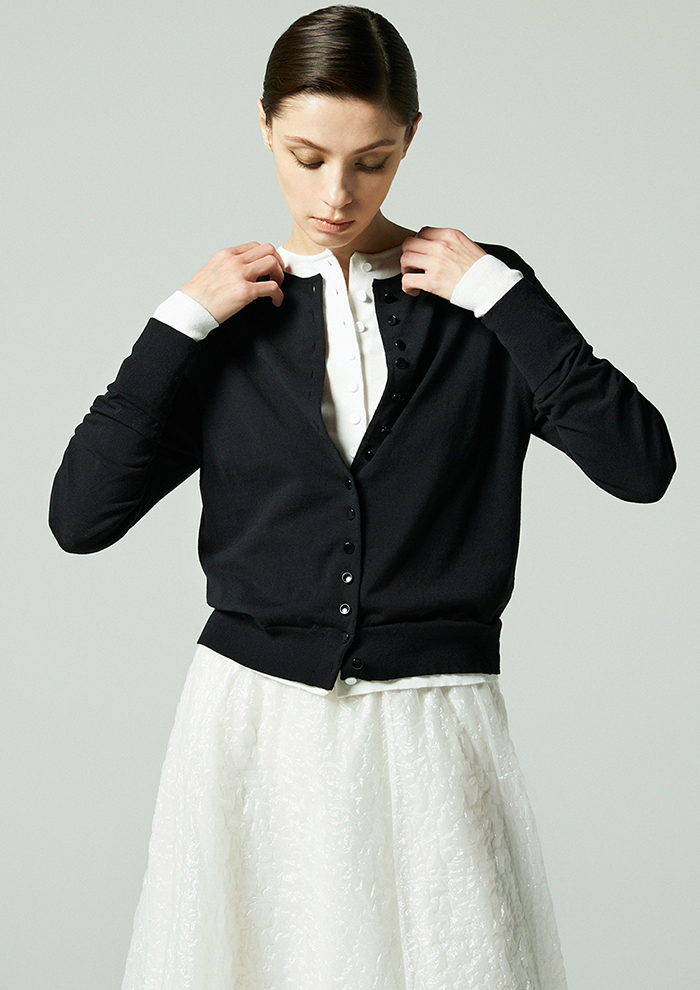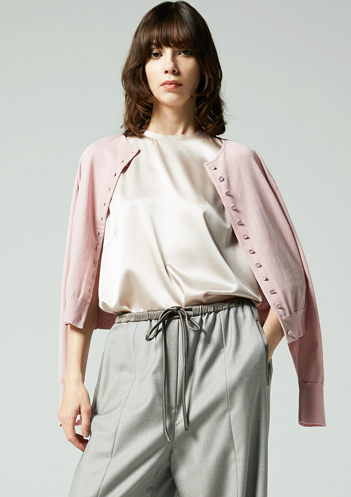 「前を閉じてプルオーバーのように着たり、カーディガンをレイヤードしたりすることで、ベーシックなアイテムも今シーズンらしい着こなしに仕上がります。春から盛夏まで幅広いスタイリングに取り入れやすく、そろえておきたいアイテムのひとつ」。