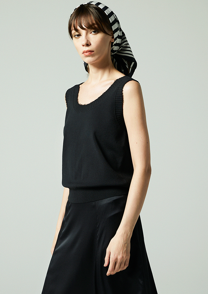 「カーディガンと合わせたいのは、襟のラインが女性らしい雰囲気の同素材のニットタンクトップ。襟口や袖口、裾にあしらったループフリンジのディテールがさりげないアクセントとなり、一枚でもサマになります」。