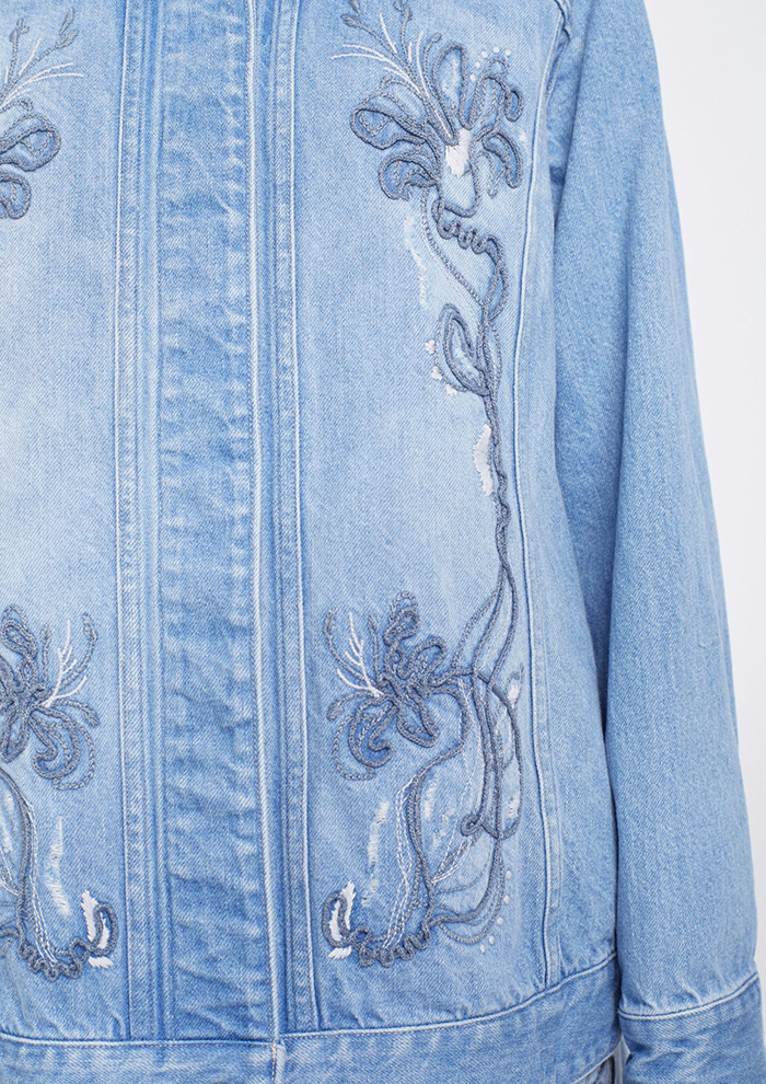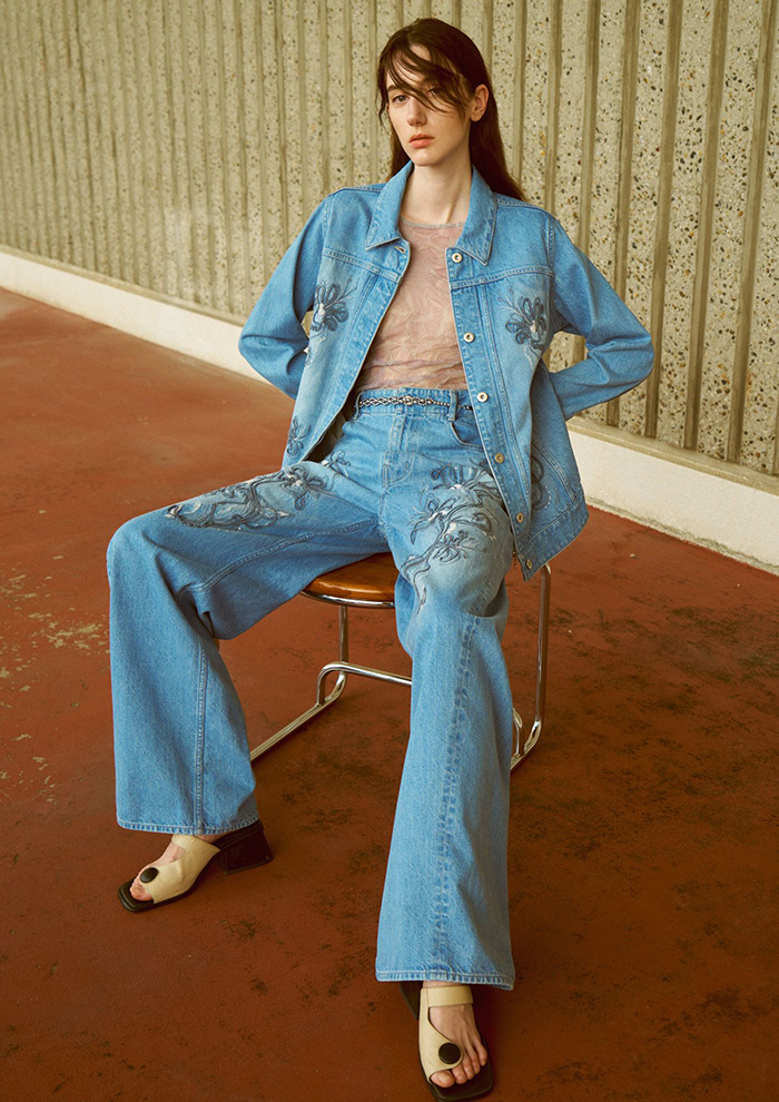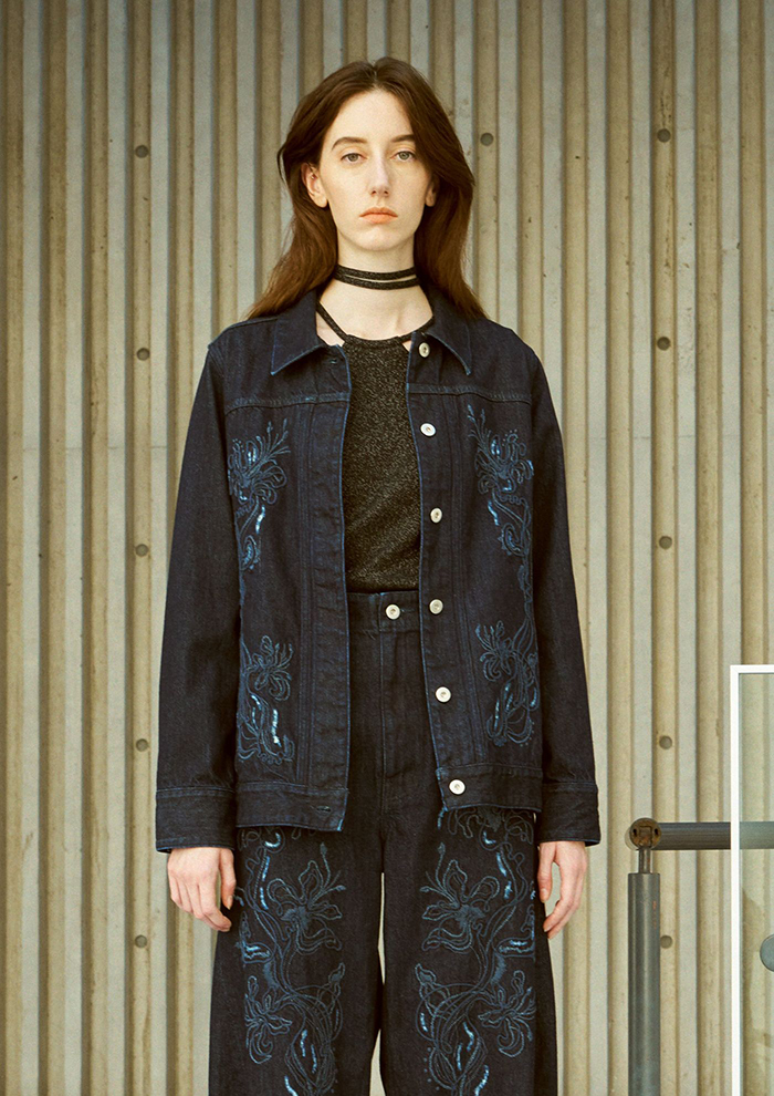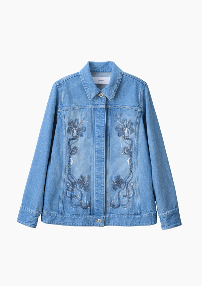 「フロント部分に立体的な刺しゅうを施したデニムジャケットは、胸ポケットを排除し比翼仕立てにしたミニマルなデザイン。切り替えによるほどよいウエストシェイプが、ソリッドなディテールのなかにアクセントを生み出します。デニムジーンズやデニムスカートとのカジュアルなセットアップはもちろん、スラックスでシックに組み合わせるのもおすすめ」。