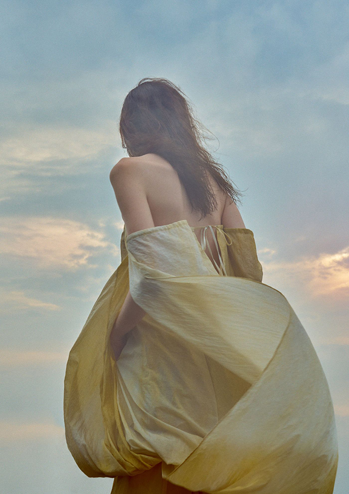 「かすかな光を宿したような佇まいが印象的なドレス。リヨセルとコットンを混紡し、美しいドレープとナチュラルタッチを叶えた、クラシカルとカジュアルが混在しているような一着です。さらにバイオ加工を施すことで柔らかさをアップ。ご家庭での手洗いも可能で、デイリーからオケージョンまで幅広いシーンで着用可能です」。