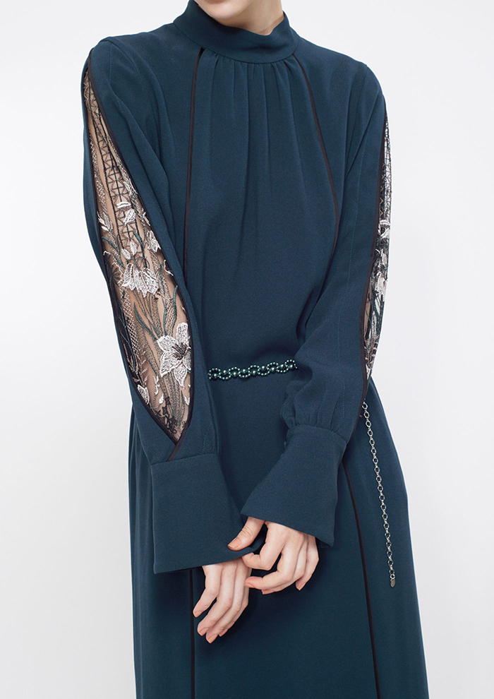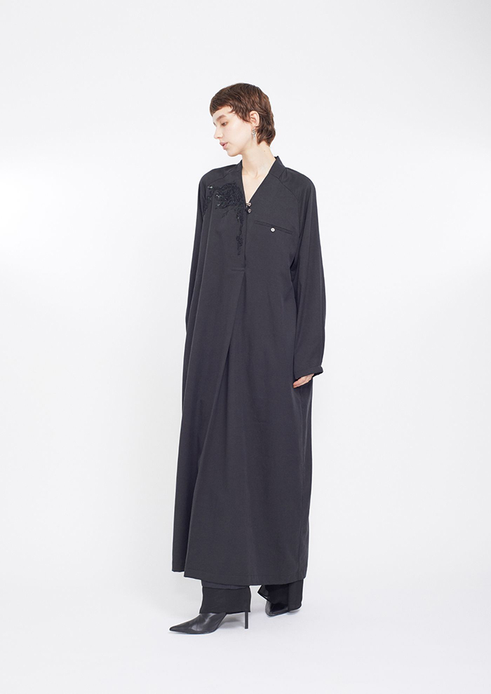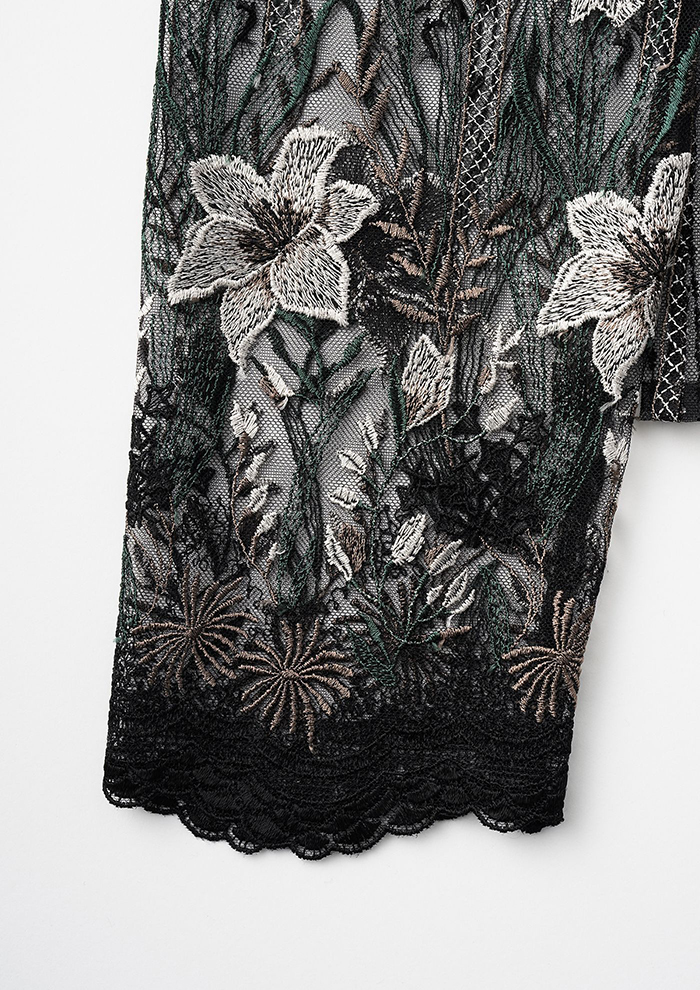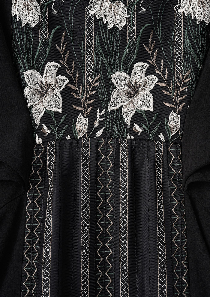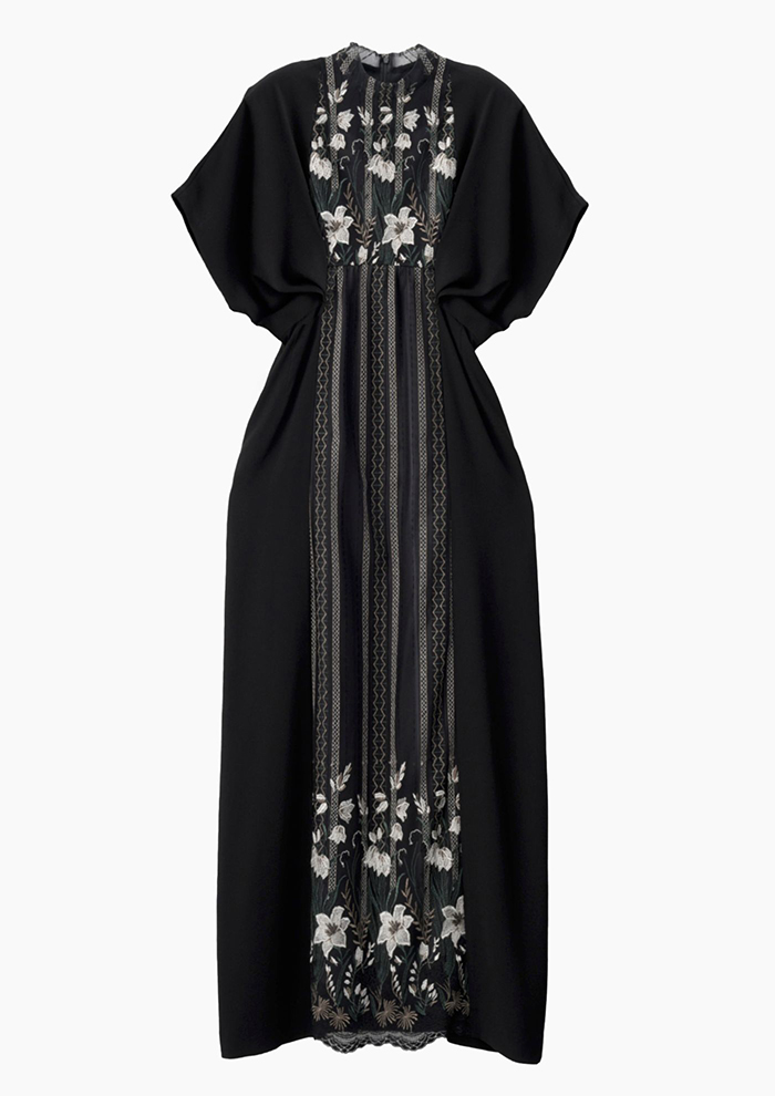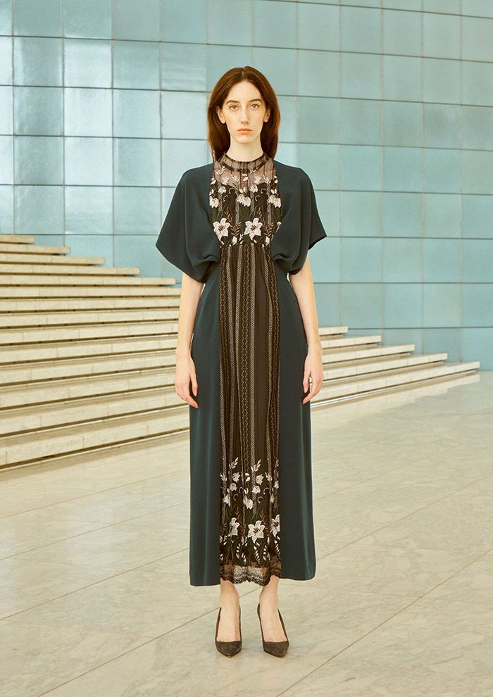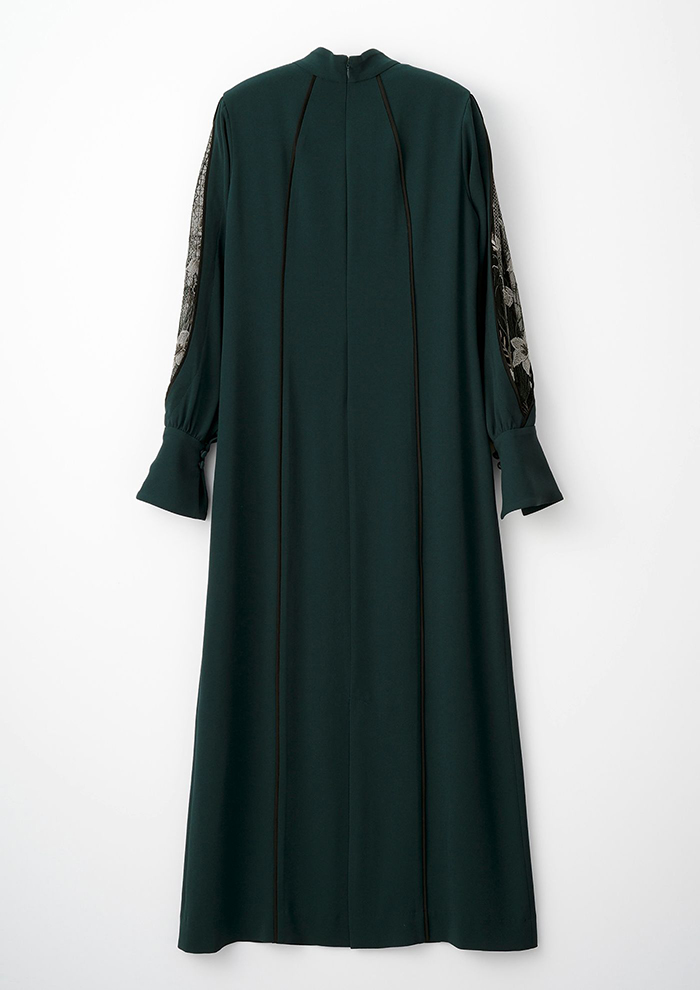 「蕾のようなカッティングが愛おしいペタルスリーブは、刺しゅうレースを包むようなデザインが立体的。穏やかなストレートシルエットにし、土台生地には発色に優れたアセテート素材を使用しています。オケージョンシーンや特別な日に最適」。