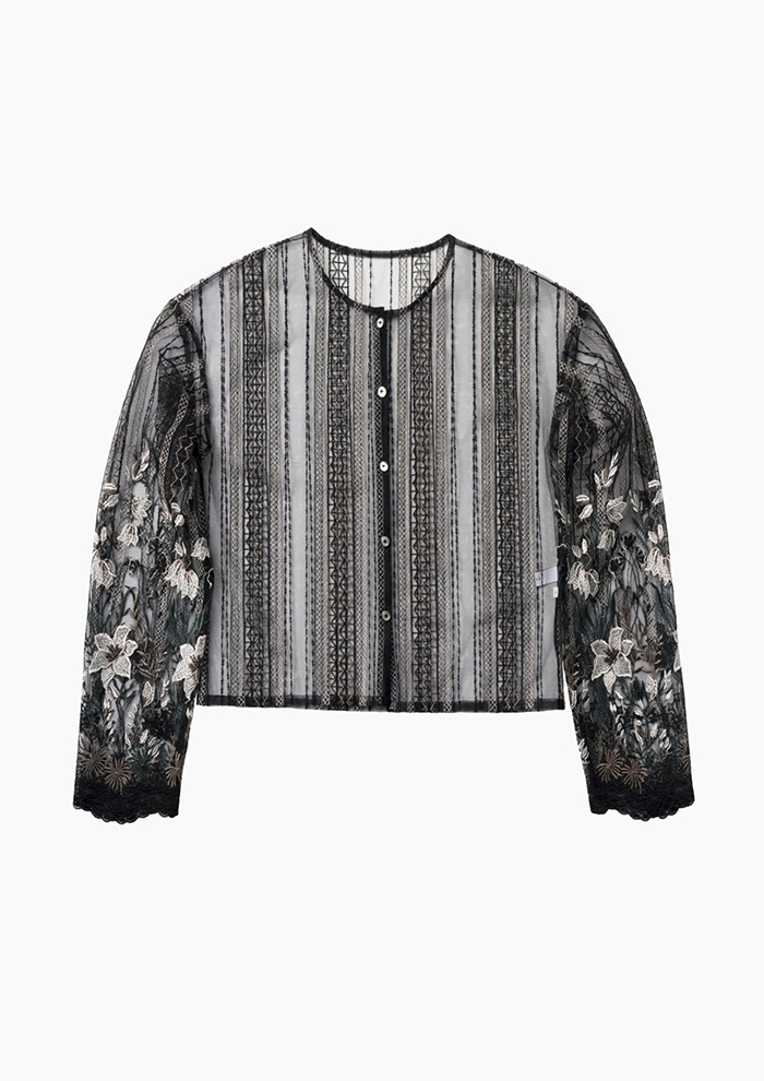 「オリジナルの刺しゅうレースを使用した総レースのカーディガン。着丈はショート丈に設定することで、合わせるボトムを選ばずに、デイリーからオケージョンシーンまで楽しめます。“Classic lace dress”へのレイヤードもおすすめ」。