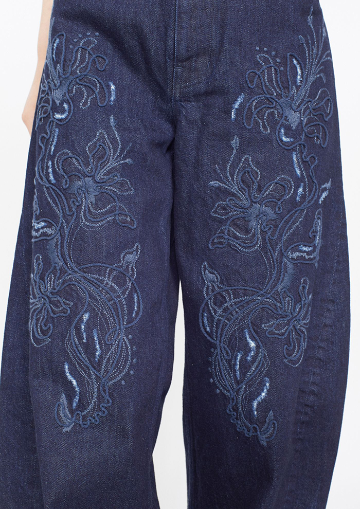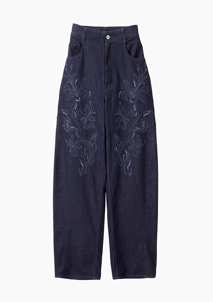 「ブランド初となる刺しゅうデニムシリーズは、国内随一のデニム産地である児島にて製作。バレルシルエットのジーンズは、裾に向かい緩やかに描くカーブのカッティングが美しい脚線美を演出します。カットソーなどのカジュアルアイテムとの相性はもちろん、ブラウスなどのクラシカルなものとも好相性。カジュアルで上品な佇まいを生み出す一着です」。