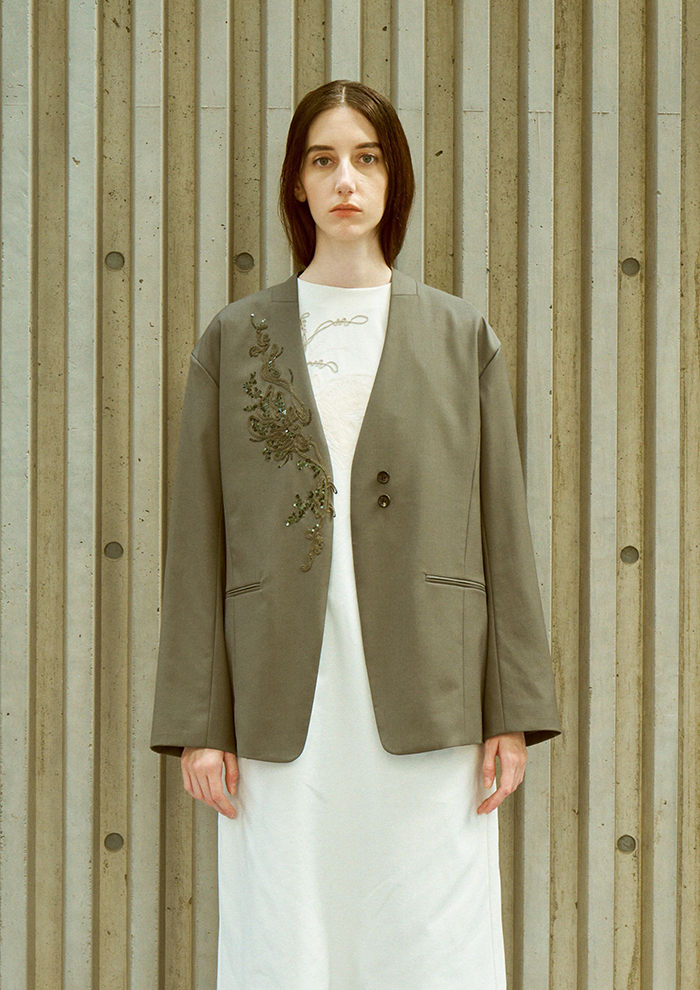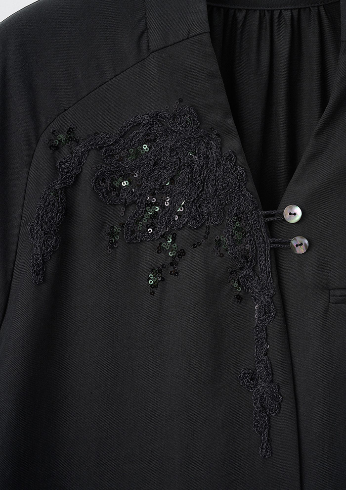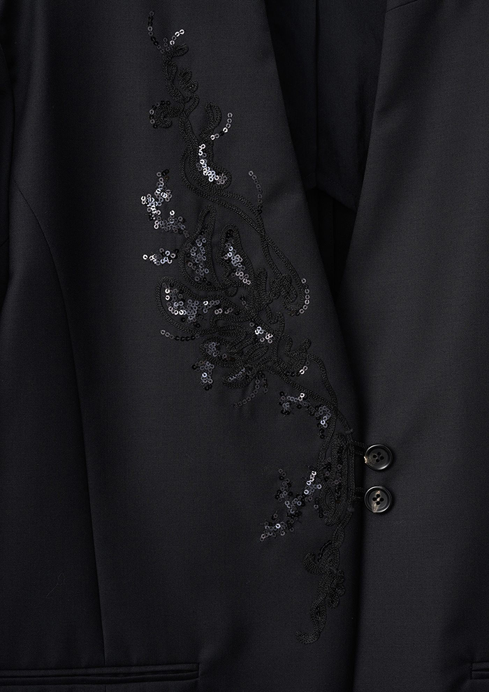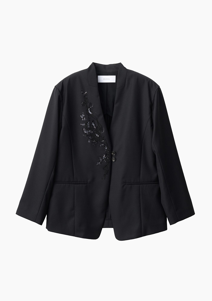 「繊細な光沢とドレープが特徴的なジャケット。ディテールを削ぎ落としたシルエットが美しいラインを浮かび上がらせるとともに、スパンコール刺しゅうをより際立たせる役割も。セットアップでの着用はもちろん、デニムと組み合わせてカジュアルに着こなすのもおすすめ。オケージョンやデイリーまで、シチュエーションを選ばず幅広く着用できます」。