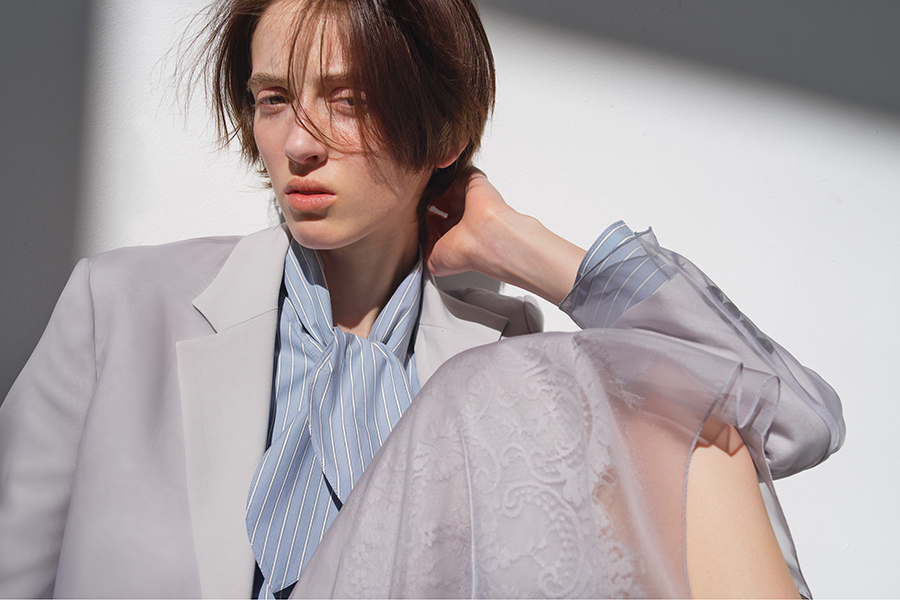 「柔らかな光をまとう、ニュアンスカラーでまとめたエレガントなスタイリング。ジャケットとスカートは、ブランド定番のダブルジョーゼットにオーガンジーをレイヤードしたシリーズ。軽やかな透け感が奥行きを生み、動くたびに表情が変化します。ジャケットは季節を問わず着用できる軽い着心地で、合わせるアイテム次第でデイリーから華やかなシーンまで対応。スカートはボリュームを持たせたIラインシルエットで、内側の裾にあしらったレースがさりげなく透ける、大人の遊び心を感じさせるデザインです。襟元のダブルリボンが印象的なストライプシャツは扱いやすさも◎」。