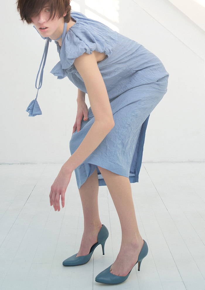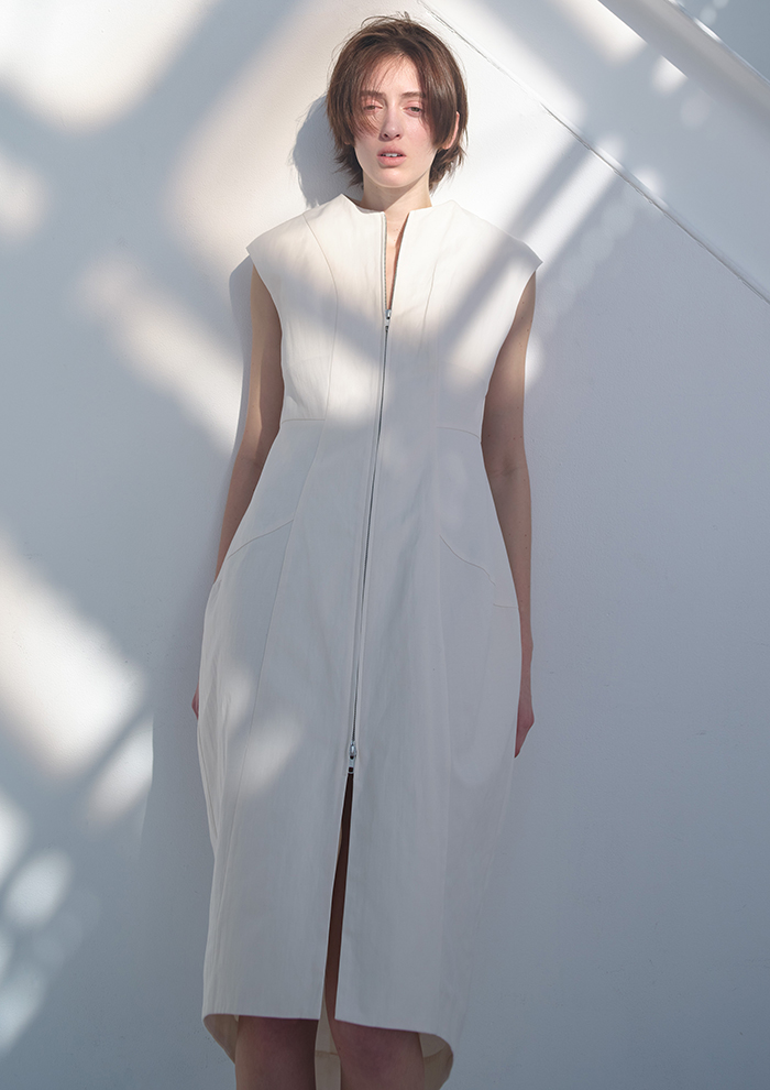 「洗いざらしの風合いを残しながらもハリのある、コットンとヘンプの混紡生地を使用したワンピース。花瓶のような構築的かつモードなシルエットを、パターンワークによって表現しました。一枚でさらりと着るのはもちろん、ノースリーブコートのようにレイヤードするのもおすすめ」。
