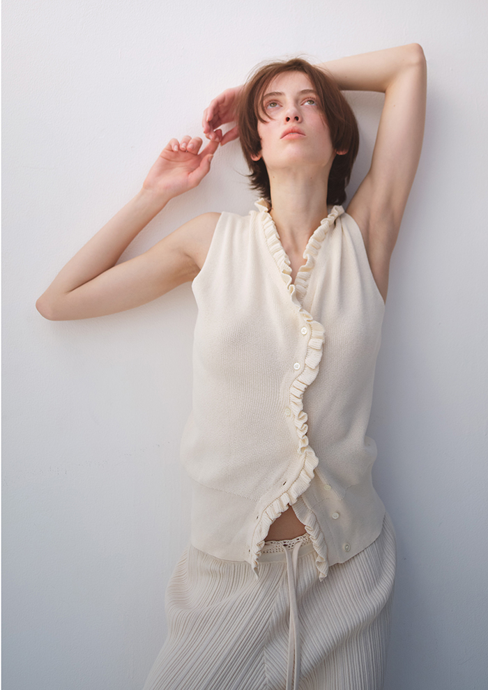 「今シーズンを象徴する、しなやかさと構築性を兼ね備えたニットのセットスタイル。トップスは、ブランドらしく再解釈したトレンドのニットベスト。アシンメトリーに波打つ前立ては、「ミラ ショーン」を象徴する“ONDA(波)”柄をイメージしています。立体感のある畦編みにし、一枚でもレイヤードでも存在感を発揮。ボトムは、トップスと同素材で仕立てたニットパンツで、伸縮性に優れたストレスフリーなはき心地に加え、裾のフリルがさりげないアクセントです。肌触りの良い素材は、シーズンを問わず活躍」。