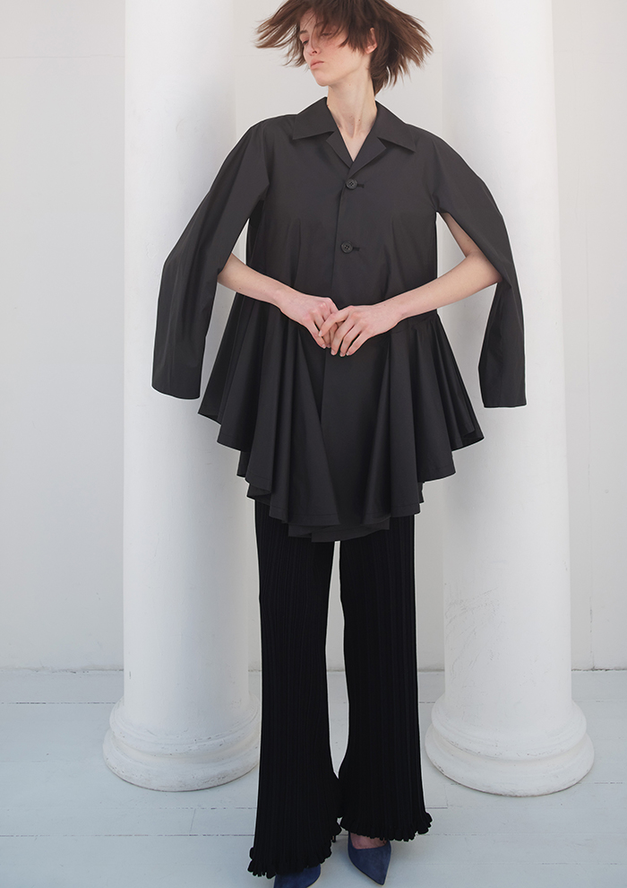 「アシンメトリーに揺れるペプラムラインが印象的な、ブランドらしいニュアンス感のドレスコート。撥水加工を施した別注のタイプライター素材を使用し、軽やかさと適度なハリ感を両立しています。脇部分には、アームホールと別にスリットを配しており、腕を通さずケープのように羽織るアレンジも可能。着こなし次第で表情が変わる、機能性とエレガンスを兼ね備えた一着です」。