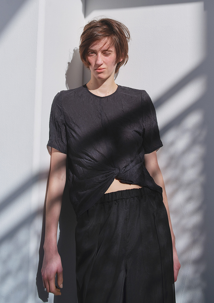 「フロントのギャザーデザインが印象的なプルオーバーブラウス。シルクポリエステルにシワ加工を施したオリジナル素材を使用し、軽やかで涼やかな着心地に仕上げました。シワが気になりにくいため、旅行などでも扱いやすく、ドレスコードのあるシーンにも対応。ロングシーズン活躍する汎用性の高さも魅力」。