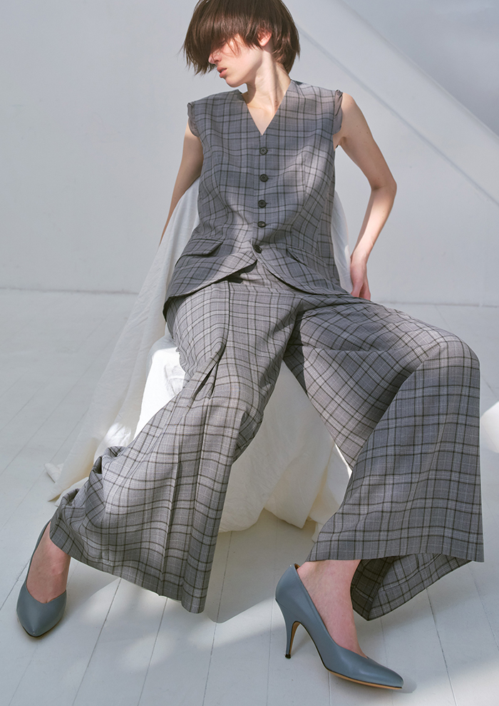 「チェック柄を主役にした、マニッシュさと女性らしさを併せ持つセットアップスタイル。トップスは、アームホールからさりげなく裏地を覗かせたノースリーブジャケット。シンプルなシルエットのなかに遊び心を忍ばせ、抜け感のあるバランスを演出します。ボトムには、同素材のワイドシルエットパンツを合わせ、統一感を演出。ウエストはリラクシーなゴムとドローコード仕様にしつつ、プリーツのように幅を持たせたインタックが立体的な美ラインを構築します。ほどよいモード感と軽やかさを備えた、洗練されたコーディネート」。