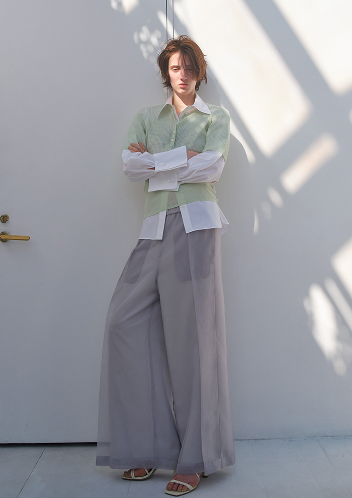 「軽やかなレイヤードが生む、奥行きのあるスタイリング。トップスには、ヘンリーネックのシアーリブニットを。裾にかけて別柄のリブを組み合わせることで、腰まわりにほどよい余白と立体感をもたせています。中にはブランド定番の大ぶりなWカフスシャツをレイヤード。今季を象徴する一輪の花を、光に透ける葉脈のような線画で表現したプリントが、さりげない存在感を放ちます。ボトムは、定番のダブルジョーゼットにオーガンジーを重ねたワイドパンツ。下生地がほのかに透けて奥行きを生み、動くたびに軽やかな表情を演出します。ウエストはゴムとドローコード仕様」。