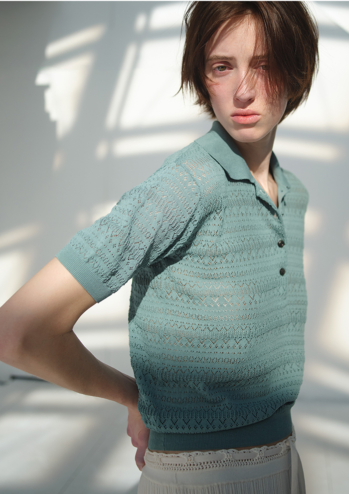 「毎シーズンご好評をいただいているポロ襟ニット。今シーズンはアイレット柄をあしらい、ほどよい透け感と軽やかさを添えました。一見メンズライクな佇まいながら、着用すると自然と女性らしさが引き立つ絶妙なバランスが魅力。シンプルでいて表情のある、タイムレスに愛される一着です」。