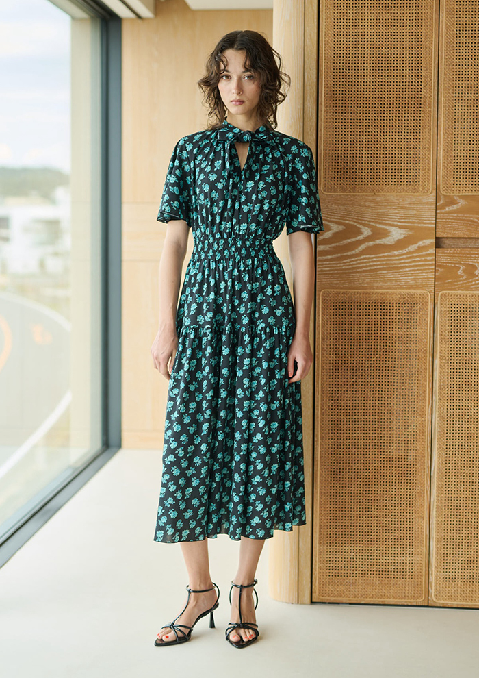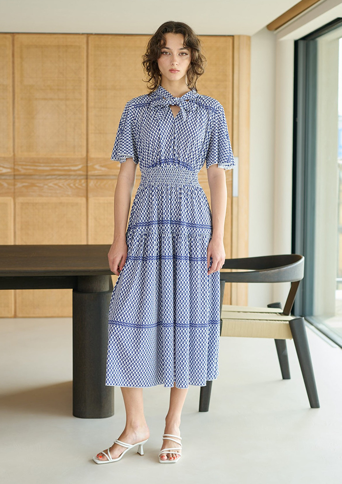 「今季は“ニースの芸術性と工芸性”をテーマに、南フランス・ニースの文化遺産からインスピレーションを受けています。ピカソ、マティス、シャガールなど、数々の著名人がこの地に滞在し残した代表作にインスパイアされた柄はまさにアートのような美しさ。また、多くの宮殿様式から着想したレース柄、表情豊かに変わる海の色のようなカラー構成も魅力です。人気のボウタイリボンドレスには、上品かつ涼やかな半袖ドレスが仲間入り」。