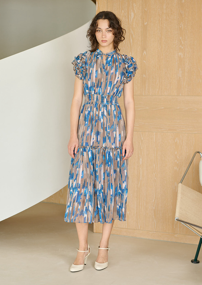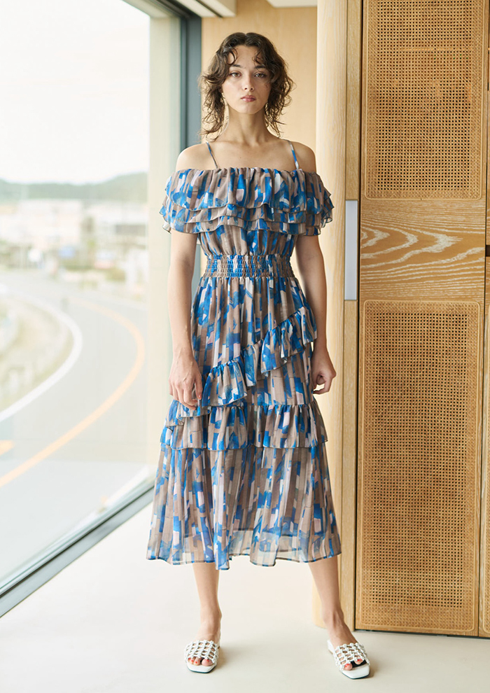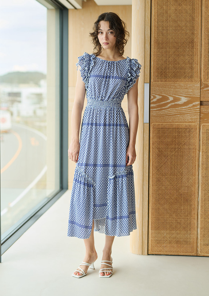 「ラッフルの袖が二の腕をほっそり見せてくれる、人気急上昇中のラッフルショルダードレス。今季は、ジャージー素材の爽やかな幾何学柄“マティス”と、絵画のような美しさのシフォン素材“ゲルニカA”プリントをご用意しています。顔まわりやデコルテに存在感を出し、ウエストから下半身の着痩せ効果も抜群。お出かけ着としてはもちろん、ブライダルシーンのお呼ばれ服としても活躍します」。