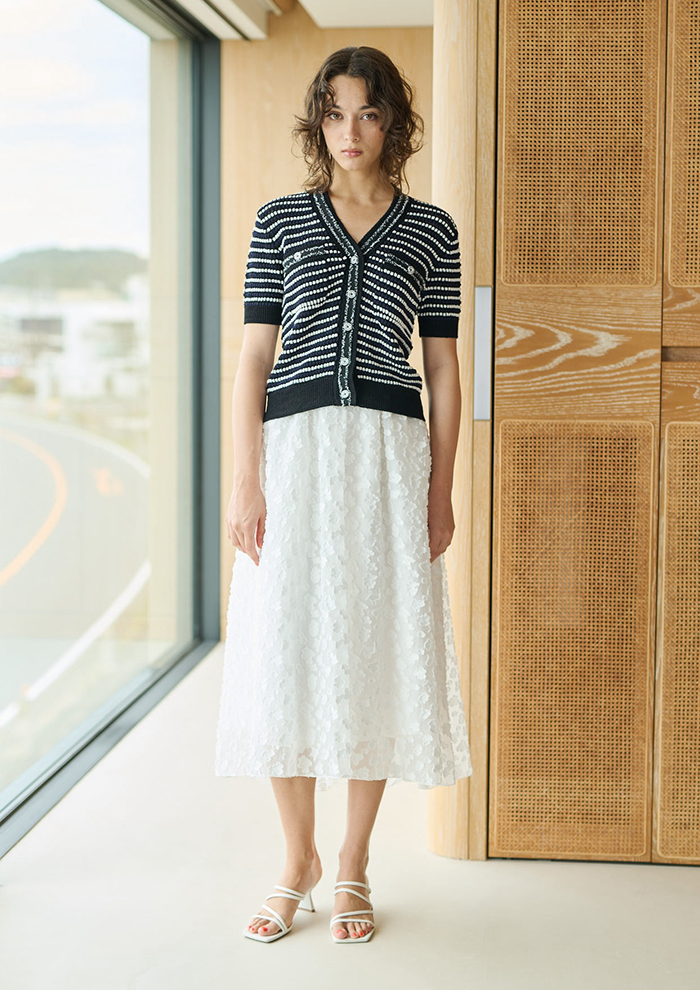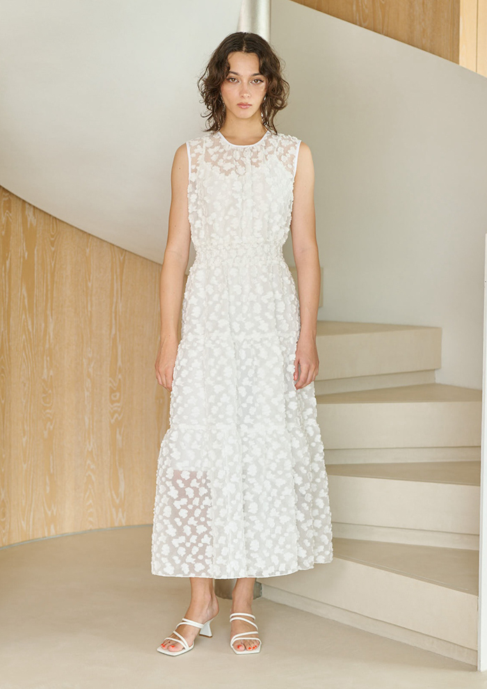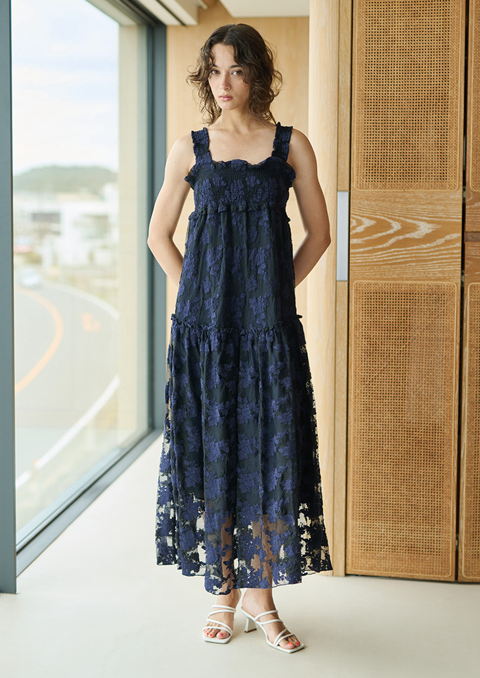 「今季初お目見えの新型ドレスも要チェック。立体感のあるユニークな素材の“ミモザコードドレス”は、高い技術のミモザコード刺しゅうを施したもの。華やかさと抜け感があり、ネイビーのシックな雰囲気も調和しています。何気ないシーンでもサラッと着こなせる、サマードレスのいち押し。そして美しく繊細な生地で仕立てた、クチュールライクな“カットジャカードドレス”は、春夏のとっておきのシーンに最適。動くたびに軽やかに揺れて、佇まいまで魅力的に見せます。花嫁のカジュアルなブライダルドレスとしても◎」。