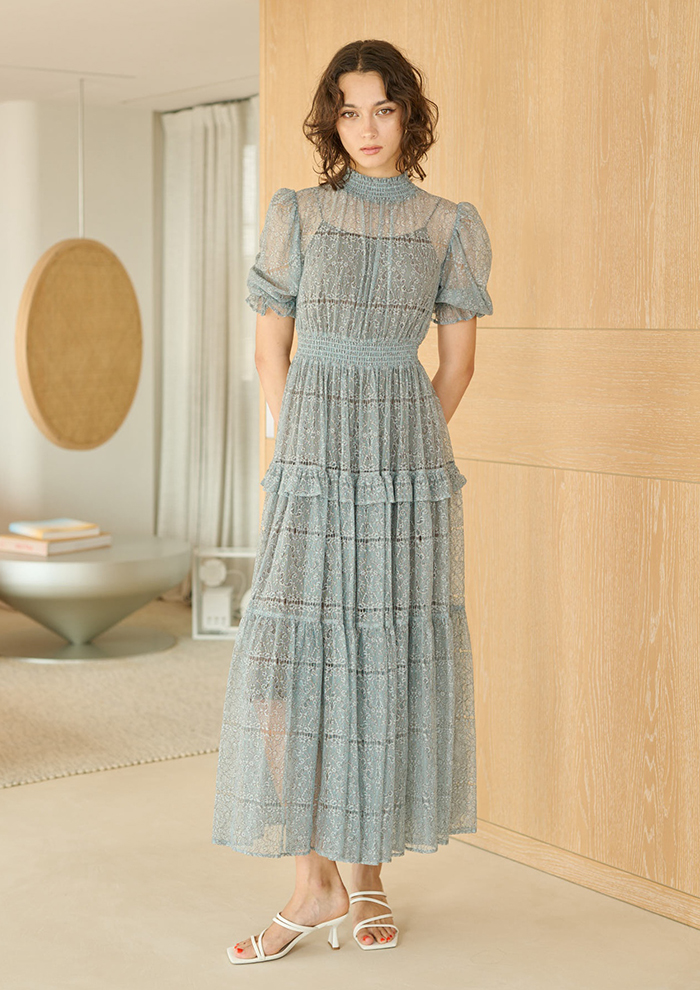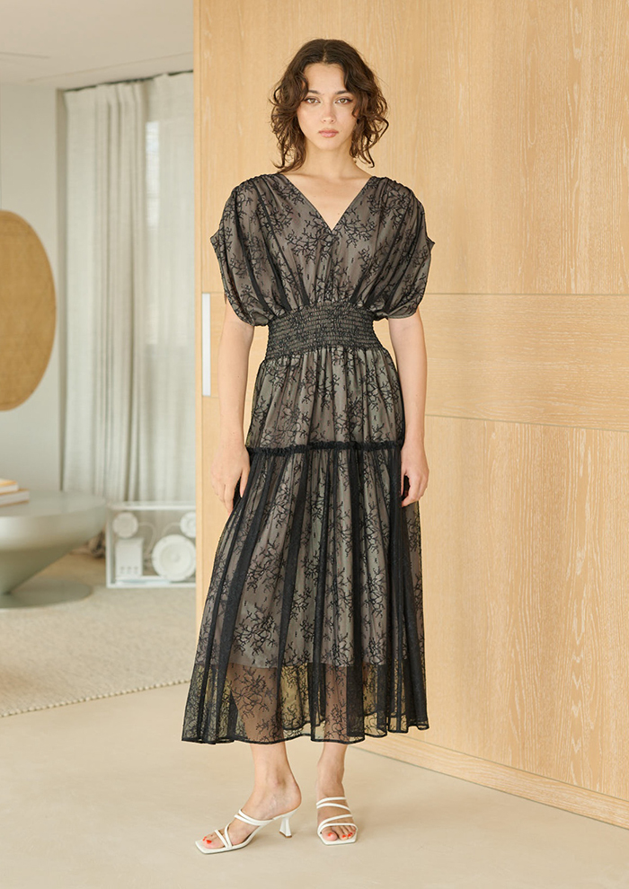 「繊細な美しさが際立つ総レースのドレスも新作。アンニュイカラーの“イノセントレースドレス”は、柄がボーダー状に並んでいるため、すっきりとスタイルアップして見せてくれます。インナードレス付きも安心感◎。優雅にドレープが落ちる“シャーリングジャカードドレス”は、繊細なかすみ草をモチーフにしたシャーリングジャカード素材です。裏地のピンクベージュと黒のレースのコントラストが絶妙な抜け感を演出。品の良い肌見せとドラマチックなシルエットによって、ワンランク上のドレスアップを実現します。どちらもウエストゴムのストレスフリーな着心地で、日常のお出かけはもちろん、ブライダルシーンにもぴったり」。