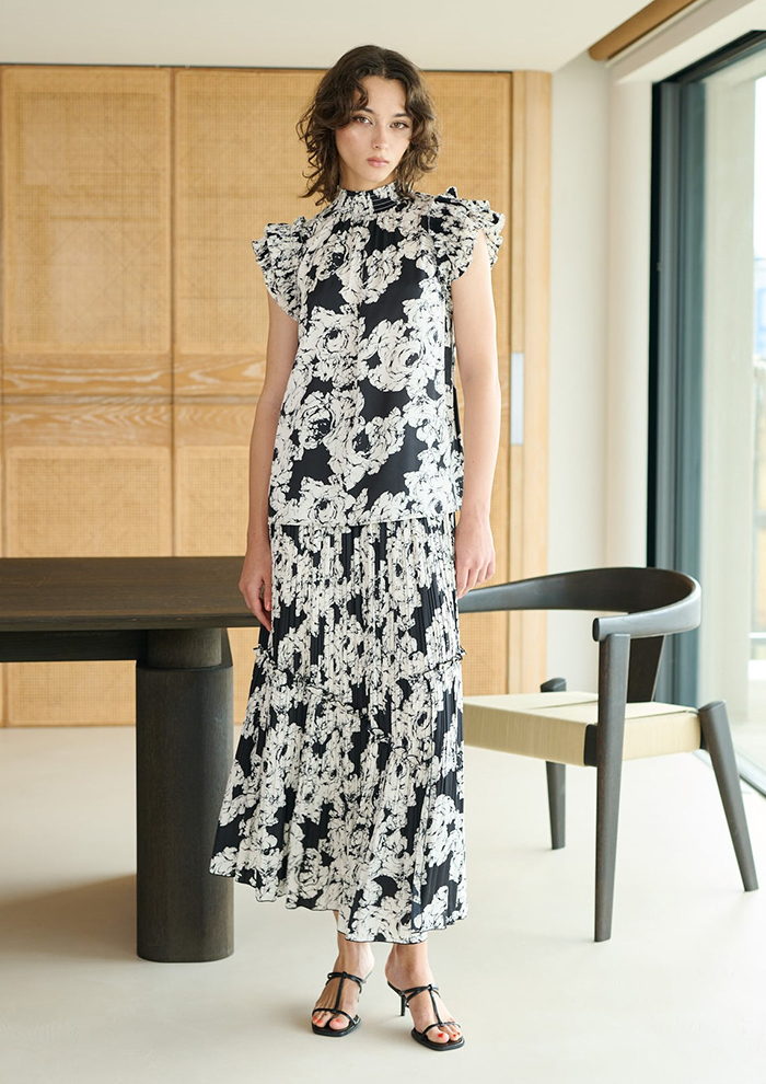 「こちらは、モノトーンのフラワー柄が大人な甘さを添えるブラウスとスカート。ブラウスは、すとんとしたシルエットにセンターのボタン配置が、すっきり見えを実現します。スカートは、ボディラインを拾わないシルエットでスタイルアップ効果抜群。どちらも素材は、ポリエステルサテンを下地にしたプリント生地。肌離れと落ち感が良く、暑い時期でもサラッと着こなせます。セットアップで着るのはもちろん、単品でも使い勝手が良く、一点華やかなアイテム使いにぜひ」。