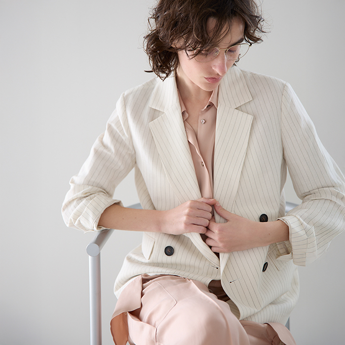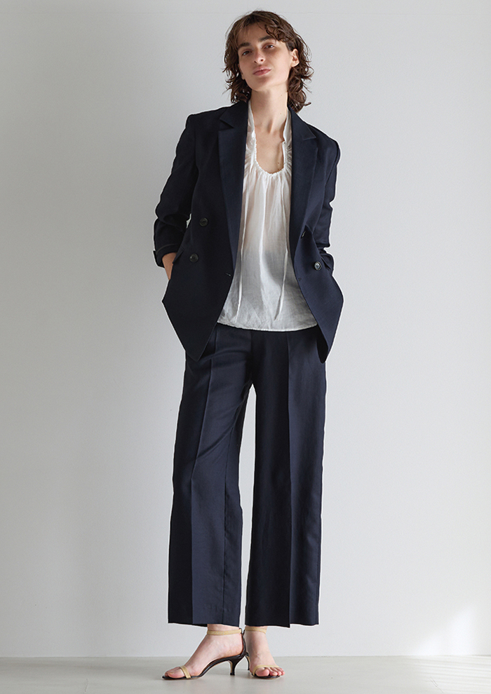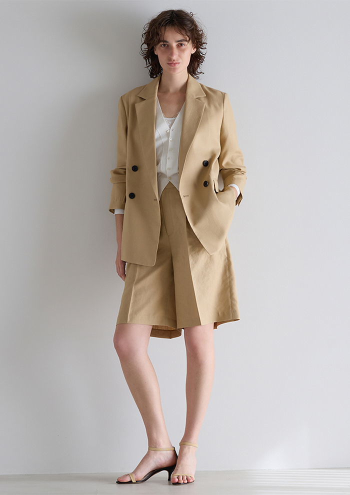 「シーンを選ばず着用できる、定番のダルスラブジャケットセットアップ。今年はサイジングをブラッシュアップしました。無地素材は糸をリニューアルし、雰囲気はそのままに、より涼しげな軽いタッチに仕上げています。ボトムはショートパンツも展開。着こなしのバランスに変化が出て一層旬度の高いスタイリングに」。