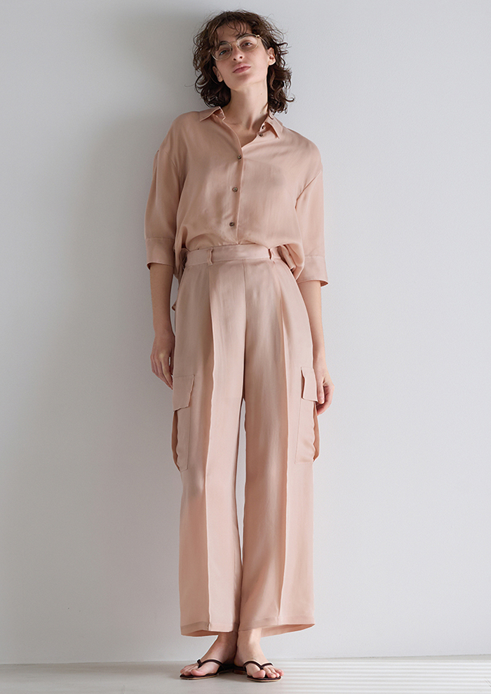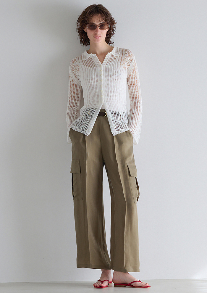 「今季注目のカーゴパンツは、とろみと落ち感のある素材で大人っぽく。セットアップで着られるオーバーサイズシャツも同素材で展開しています。春~秋まで着用できるNEWセットアップ」。