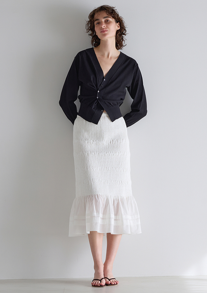「気軽に羽織れるカーディガンは、この時期の万能アイテム。リネン混のこちらは、リネンのナチュラルさはありつつ、どこかきれい目で大人な印象です。シンプルなVネックカーディガンとしてはもちろん、カシュクールで着たり、フロンタブルで着たりと3WAYでスタイリングが楽しめます」。