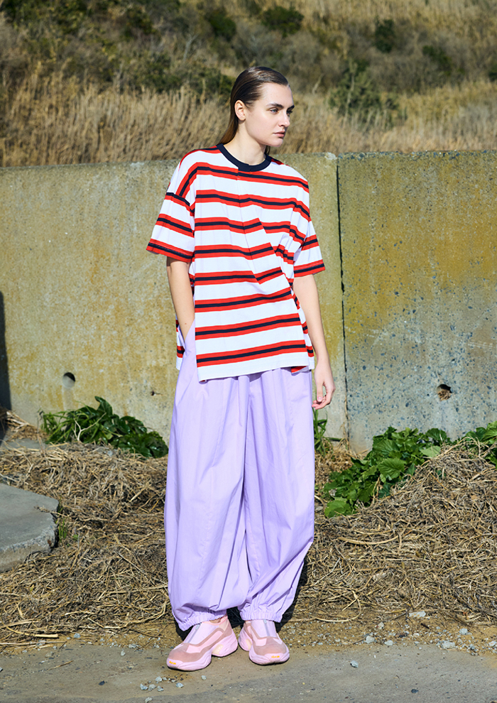 「まずは、オリジナルの配色とピッチのボーダーが印象的なTシャツから。ボックスシルエットをベースにネックと身頃にタックを施して、シンプルながらも平面的になりすぎない表情に。1枚でスタイリングの主役となるこなれたアイテムです。ボトムには、膝まわりに丸みのあるバルーンパンツを。裾巾をやや広めに設定することですっきりとした印象に仕上げ、シルエットの個性とはきやすさを両立。シワになりにくい2WAYストレッチ高密度タフタ素材です」。