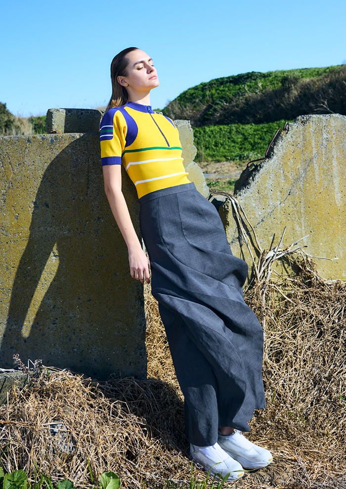 「ビンテージのサイクリングジャージから着想を得た、スポーティな印象のサイクリングプルオーバー。ピッチからオリジナルで作成し、「ナゴンスタンス」らしい遊び心のある配色に仕上げました。スカートは、山の綾線をイメージした凹凸のあるシルエット。ベースはストレートのため、デザイン性がありながらも落ち着いた印象で着用できます。甘さを抑えた構築的な表情が大人っぽい雰囲気。どちらのアイテムも、シンプルになりがちな夏のスタイリングに、アクセントを加えます」。