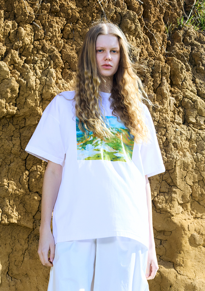 「ベーシックなTシャツをベースに、油絵作家の羽生 みつ子氏のアートワークを前身頃にプリントしたアイテム。シンプルながら目を引く柄が、着映えを約束します。幅広いコーディネートに取り入れやすいのもポイント」。
