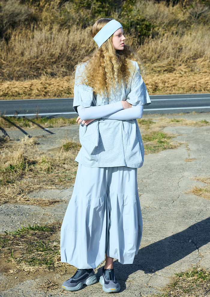 「岩肌をイメージし、マチのようにパーツを組み合わせて立体的なフォルムを表現したTシャツ。ボディラインを拾わないリラックスシルエットにし、安心感のある着心地に仕上げています。これ1枚で、スタイリングにインパクトをプラス。インナーは、ほどよくフィットするロングスリーブトップス。1枚での着用はもちろん、インナーとして差し色のスタイリングもおすすめです。ボトムには、大きな岩をイメージした、立体的な裾フォルムのスカートをスタイリング。自然の造形美から着想を得た、力強さと存在感のあるデザインが特徴です。軽やかな素材のため重くなりすぎないのも◎」。