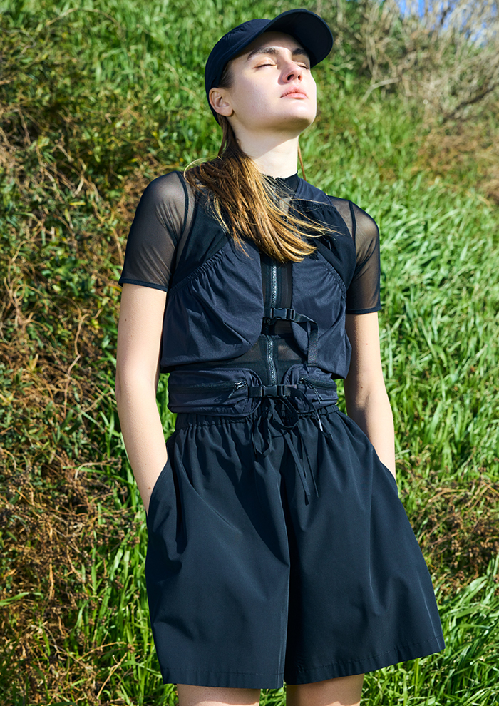 「さまざまなポケットをあしらい、機能性に優れたトレイルベスト。フロント上部のポケットには、ストレッチメッシュ素材を使用し、ボトルなどを収納しやすいホールド性を備えています。サイドポケットはマチ付きで、小物類もすっきりと収納可能。アクティブなシーンはもちろん、デイリー使いにもおすすめです。インには、体にフィットするサイクリングプルオーバーを。前後にポケットを備え、アクティブな動きのなかでも携帯などの小物をしっかりとホールドできる設計に。パンツは、ストレスなく着用できるシャツ地のキュロットパンツ。広めの裾巾が、足元をすっきりと見せてくれます。そしてキャップは、サイドにベンチレーションを施し、通気性に配慮したトレイル仕様。つばは二つ折りにできるため、コンパクトに折りたたんで持ち運びも可能です」。