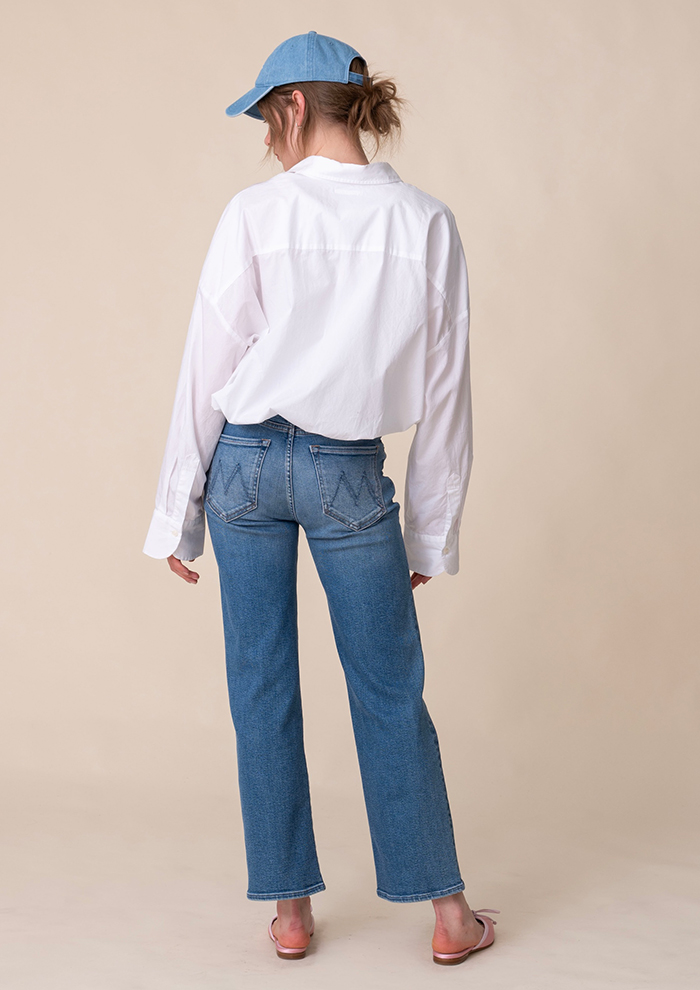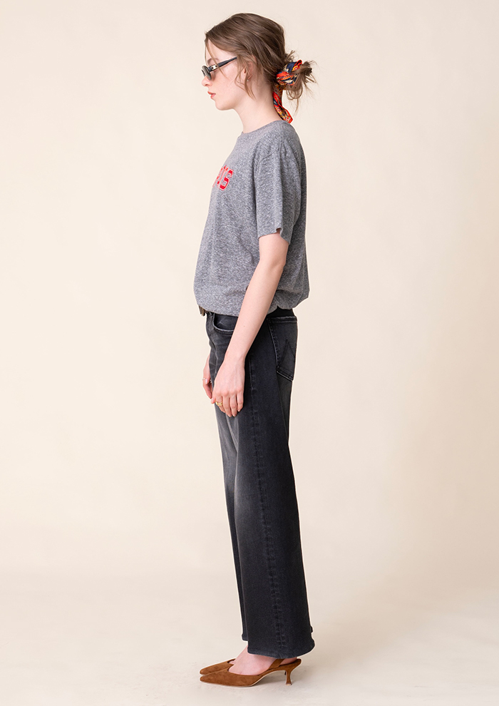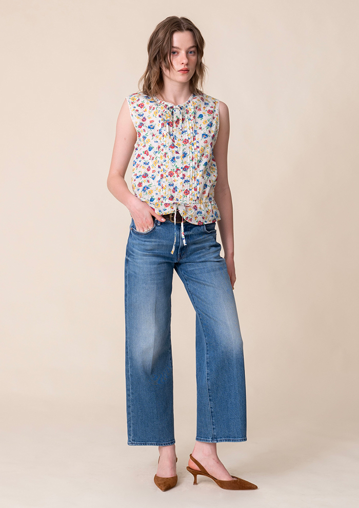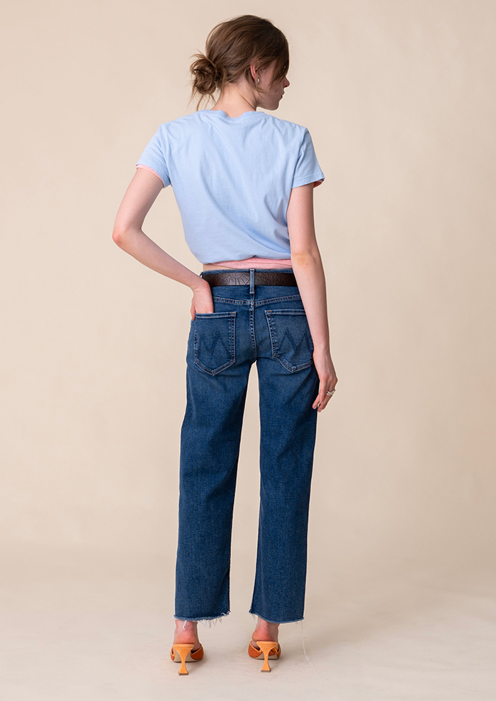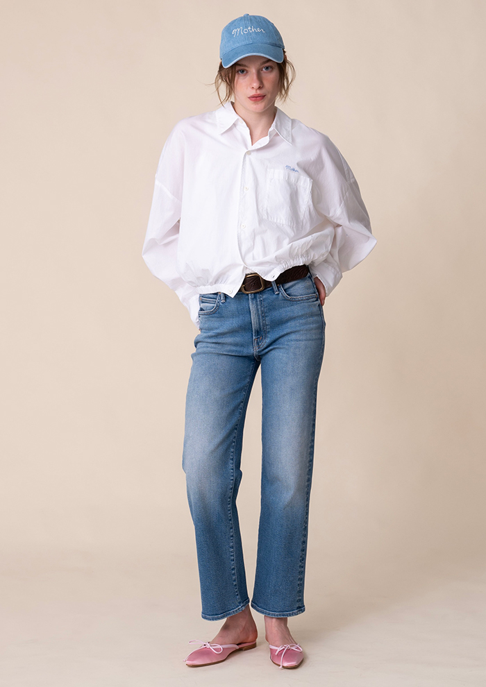 「きれい目な印象を持つ「マザー」のストレートデニムは、何本持っていても困らない定番アイテム。細身のすっきりとしたシルエットから、ほどよくゆとりのあるストレートまで、スタイリングや気分に合わせて選べるのも魅力です。カラーやシルエットの違いを楽しみながら、お気に入りの一本を見つけてください。こちらは、ゆとりのあるアンクル丈のブルーデニム。膝に入ったウォッシュが印象的で、カジュアルながらもバランスよく着こなせます。足元にヒールを合わせれば、抜け感のある大人のカジュアルスタイルに」。