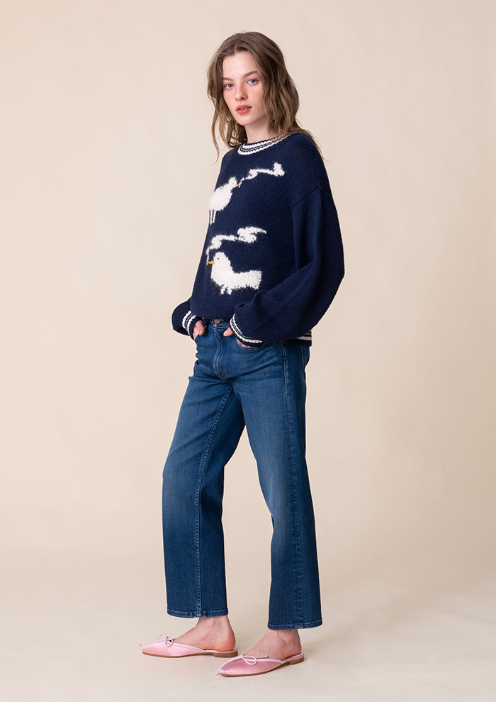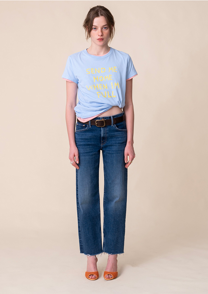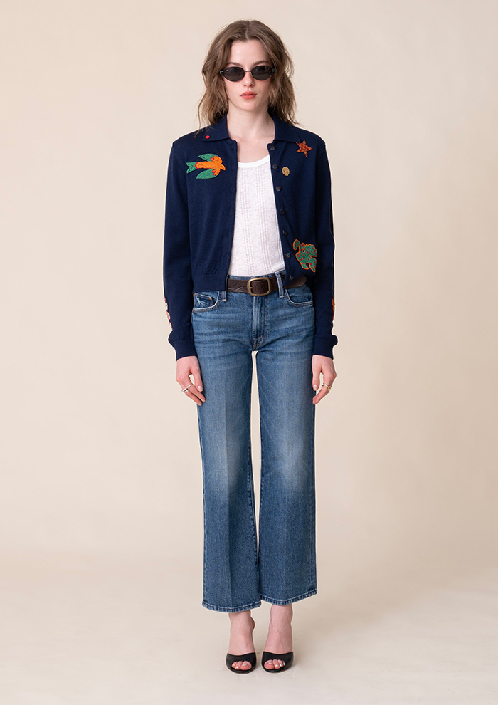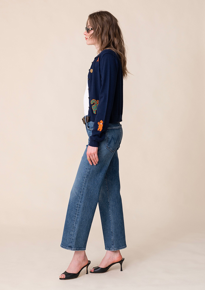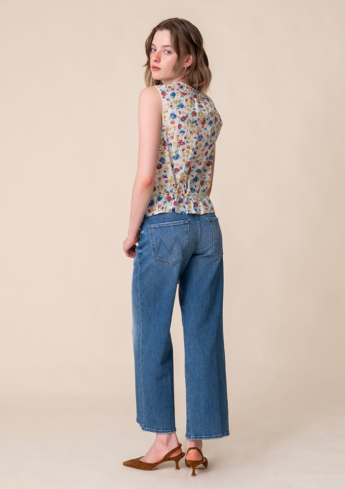 「きれい目な印象を持つ「マザー」のストレートデニムは、何本持っていても困らない定番アイテム。細身のすっきりとしたシルエットから、ほどよくゆとりのあるストレートまで、スタイリングや気分に合わせて選べるのも魅力です。カラーやシルエットの違いを楽しみながら、お気に入りの一本を見つけてください。こちらは、ゆとりのあるアンクル丈のブルーデニム。膝に入ったウォッシュが印象的で、カジュアルながらもバランスよく着こなせます。足元にヒールを合わせれば、抜け感のある大人のカジュアルスタイルに」。