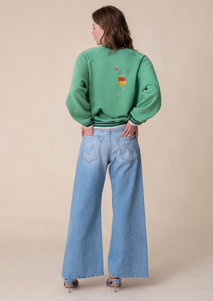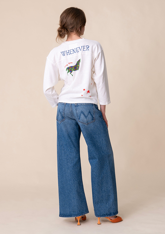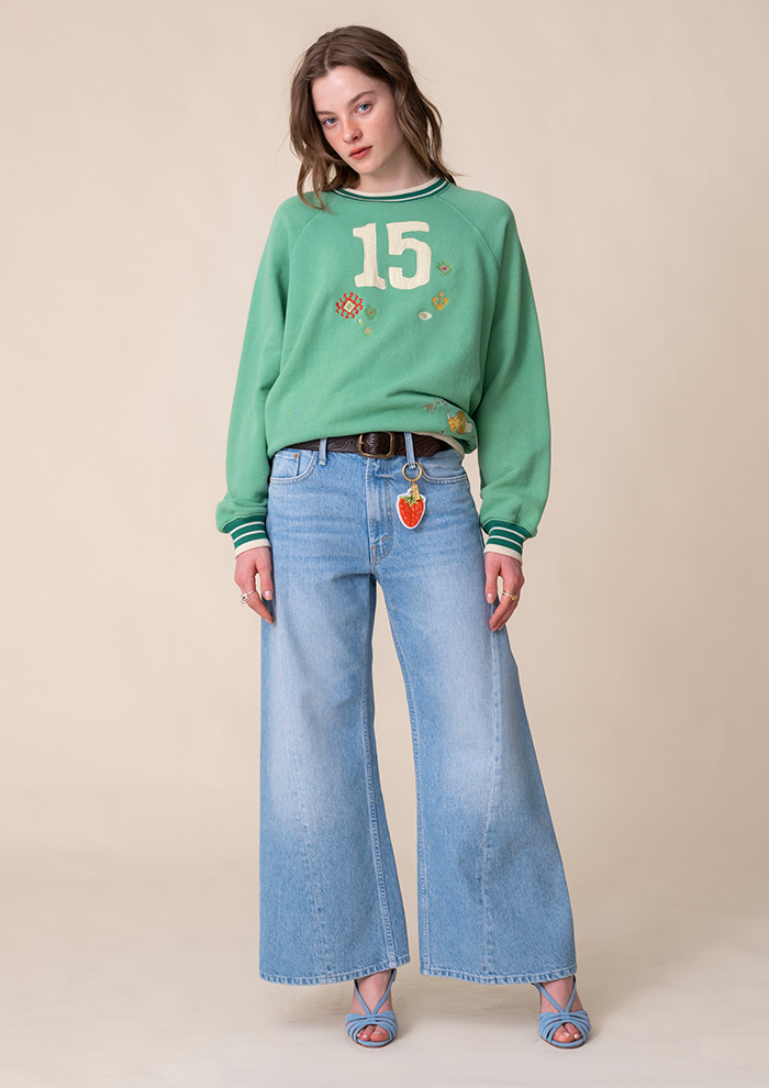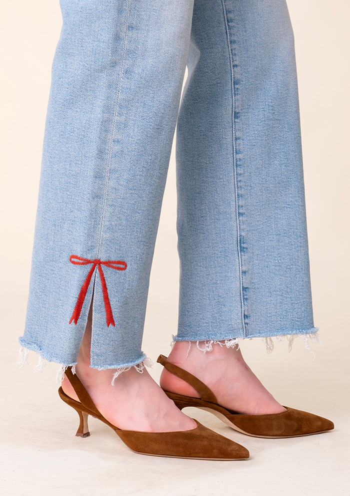 「足首に入った短めのスリットの上に、リボン刺しゅうをあしらったストレートデニム。すっきりとしたシルエットにさりげないアクセントを添えた、遊び心のある一本です。いつものデニムとはひと味違うスタイリングを楽しんで」。
