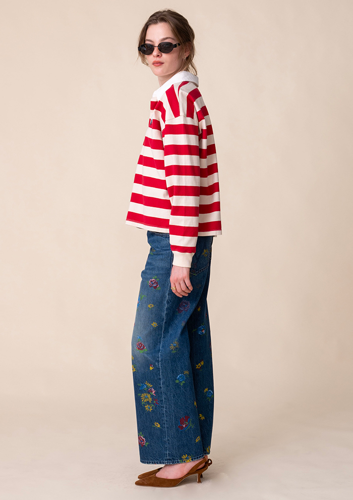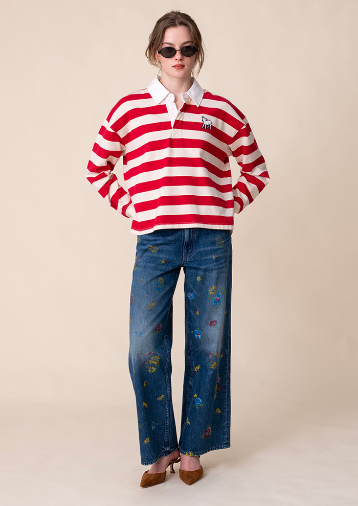 「ビンテージライクな雰囲気のフラワープリントデニム。濃いインディゴをベースにすることで、プリントの印象がほどよく抑えられ、意外とスタイリングしやすいのもポイントです。シンプルなトップスはもちろん、赤のボーダーなどでプレッピー風に着こなすのも◎」。