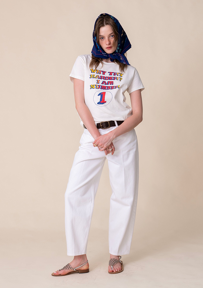 「オフホワイトのデニムは、真っ白よりもさらにカラー合わせがしやすい一本。人気の“HALF PIPE”のシルエットで、品の良いワイド感とアンクル丈のバランスもスタイリングしやすく、一本持っておくと重宝します」。