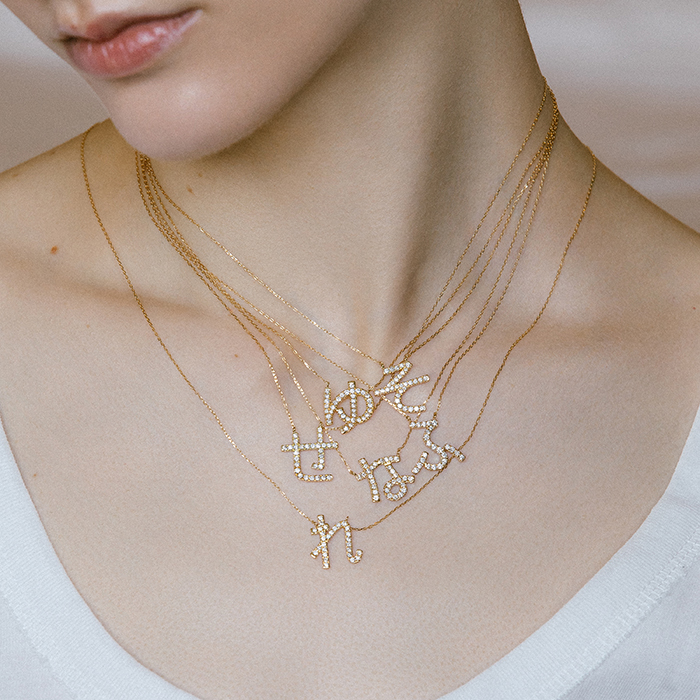 「自分だけの特別な文字を身につける、遊び心あふれるネックレス。個性とストーリーが胸元に寄り添います。シンプルなコーディネートのアクセントとしても、重ねづけのポイントとしても活躍する、唯一無二のジュエリー」。