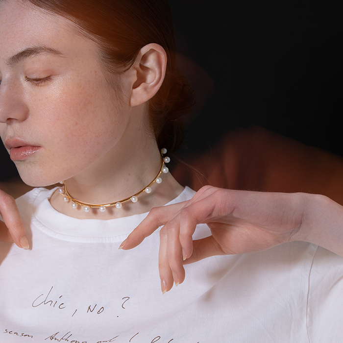 「クラシカルな美しさと現代的な洗練が融合した、エレガントなチョーカー。上質なパールが首元を優雅に彩り、どんなスタイルにも品格をプラスします。カジュアルな装いに合わせてコントラストを楽しんだり、ドレスアップシーンで華やかさを演出したり。ひとつ持っているだけで、スタイリングの幅が広がる万能アイテムです」。