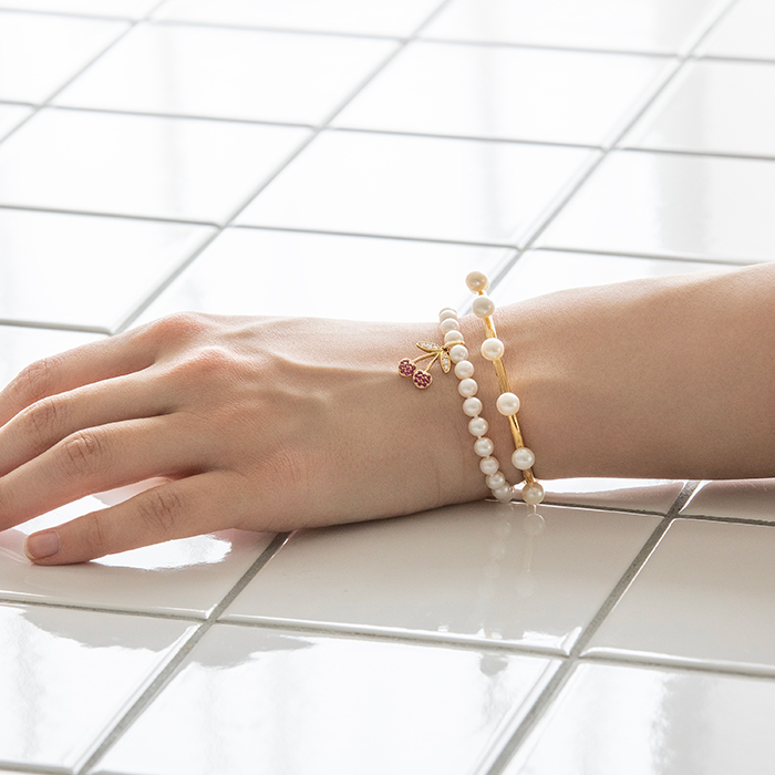 「手首を飾るパールバングル。シンプルなデザインながら存在感があり、一本でも重ねづけでも楽しめます。春の軽やかな装いに、さりげないラグジュアリー感を」。
