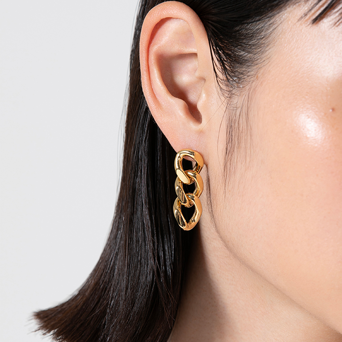 「チェーンモチーフが耳元で揺れる、モードな印象のシングルピアス。シンプルながらも存在感があり、コーディネートのアクセントにぴったりです。気分を引き締めたいモードなスタイルの日にもおすすめ」。