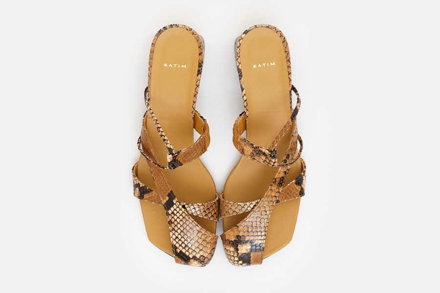 「「カチム」の春夏の人気モデル。親指から甲を横切るようにスラッシュトウチップを施した、モードかつ軽やかな5cmチャンキーヒールサンダルです。親指をカバーすることでヌーディになりすぎず、まだ涼しさが残る季節から活躍。指の付け根のベルトは細身ながらしっかりと指をホールドします。甲の細いストラップをとめる踏まず部分のパーツには隠しシャーリングを入れているため、歩行時の足の形状変化にも対応。今季はブラウンパイソンカラーとバタークリームカラーが新登場です」。