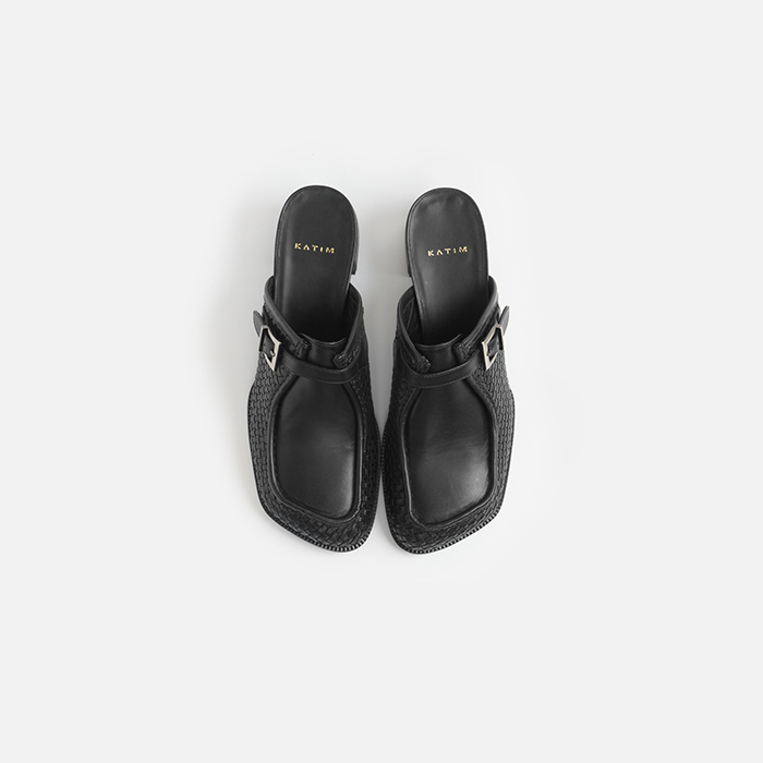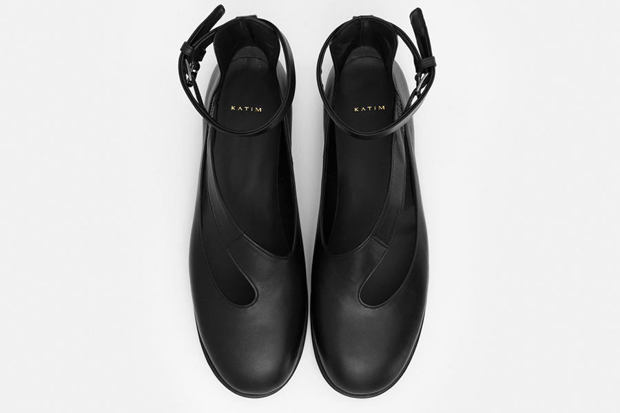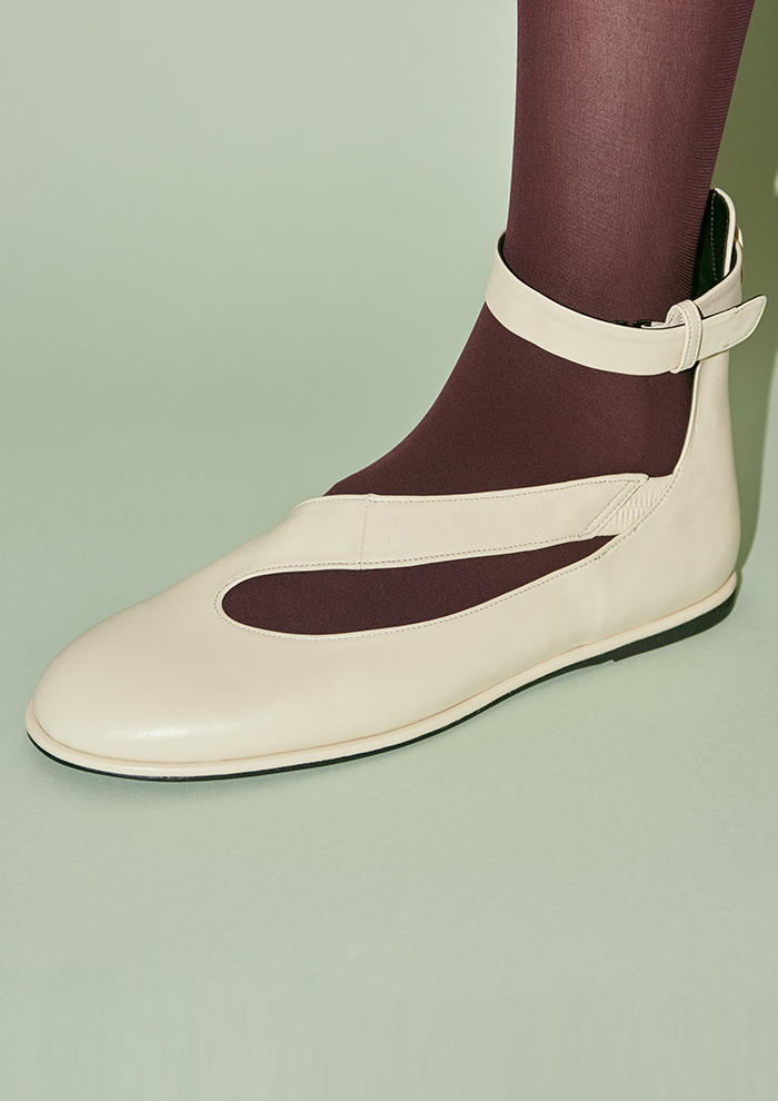 「スラッシュ型の大きな甲ベルトが新鮮なフラットシューズ“MTK(エムティーケー)”。指まわりに圧迫のない「カチム」唯一のラウンドトウフラットシューズラスト木型2605Rを採用し、アッパーには柔らかく軽いシープレザー、ソールには柔らかく返りの良いラバーを使用しています。踵から足首まで立ち上がったパーツと足首ベルトでしっかりとホールド。暖かな季節には素足に合わせて、涼しい季節にはカラータイツなどのレッグウェアと組み合わせて。足を入れるだけで完成するアートのような一足は、歩きやすく疲れにくい汎用性の高さも備えています」。