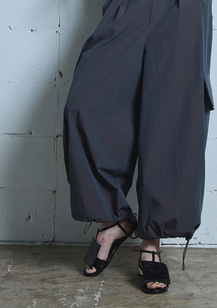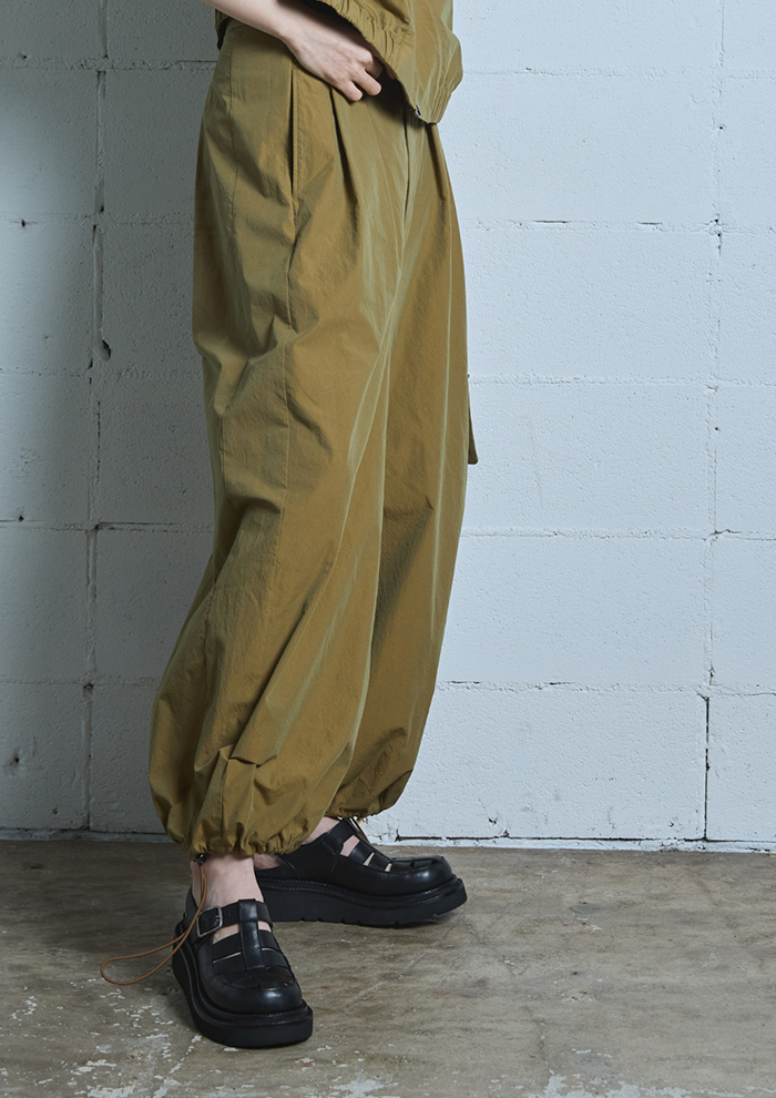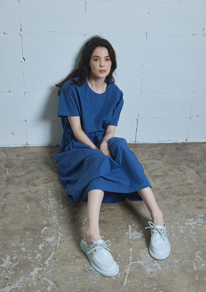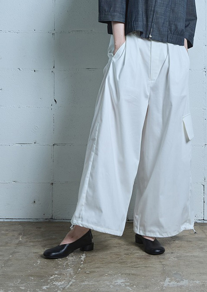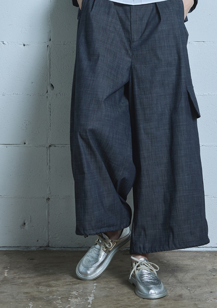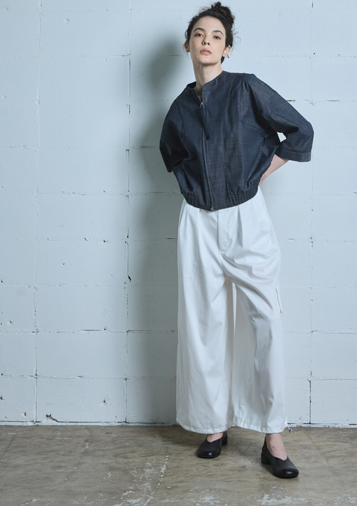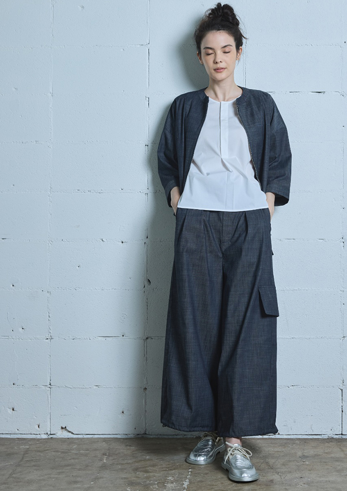 「まずは、デニム調素材の羽織と、同素材のパンツを組み合わせたセットアップから。軽やかタッチと落ち着いたカラーリングが、大人のカジュアルスタイルを演出します。パンツは裾にドローストリングを施し、シルエットの変化も楽しめるデザインに。それぞれ、セットアップでも単品でも活躍します。シルバーのデッキシューズや厚底の白シューズを合わせると足元に存在感が出て、全体を引き締めてくれます」。