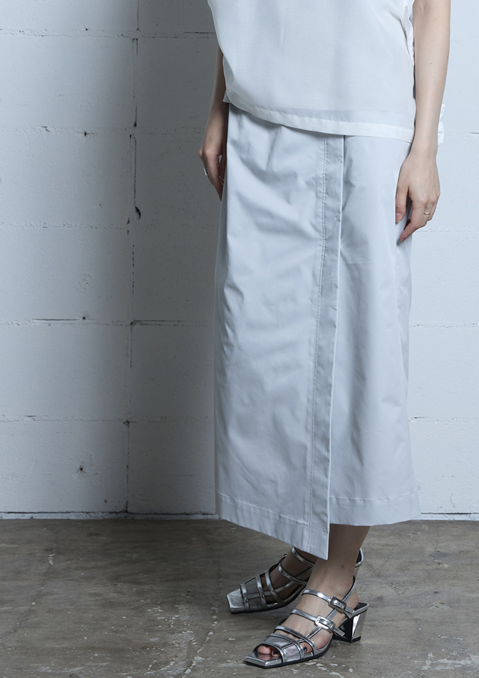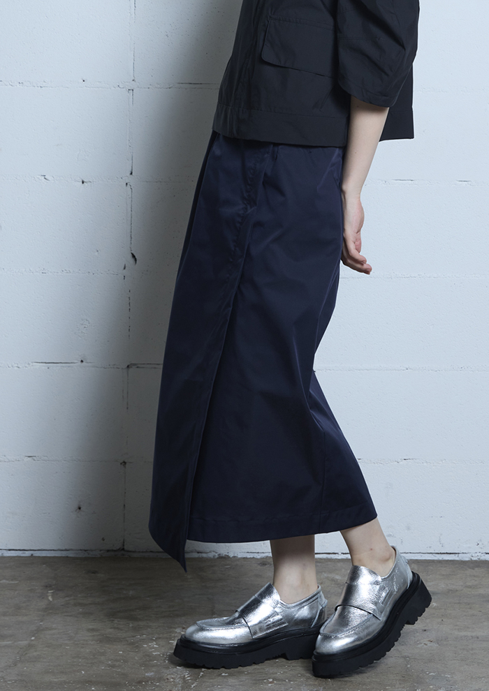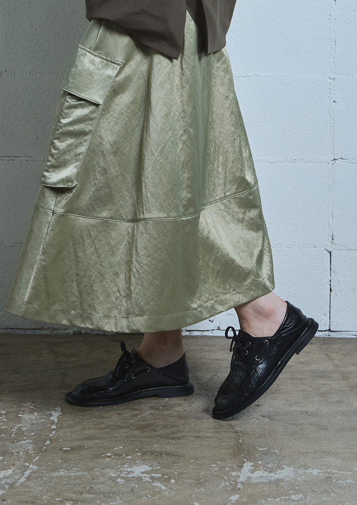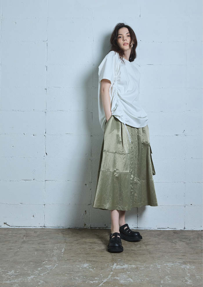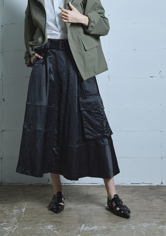 「サテンの光沢感とモードなディテールが目を引く、主役級のフレアスカート。ワークポケットや切り替えといったカジュアルなディテールも、品の良い質感によって大人な着こなしを叶えます」。
