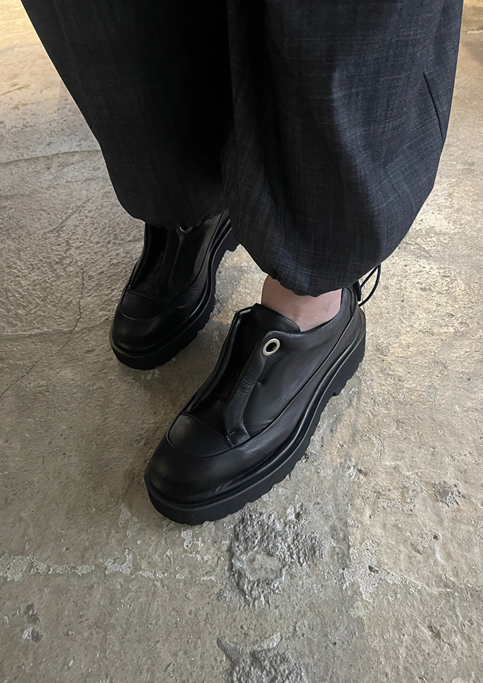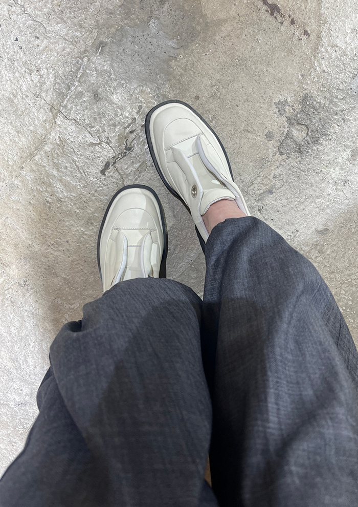 「ソフトレザーの質感と撥水加工の機能性を兼ね備えた、まさに“大人のための万能シューズ”。ボリュームのある厚底は今のトレンドをしっかり押さえつつ、レザーの品格があるおかげで、普通のスニーカーよりもクラス感のあるスタイルに仕上がります」。