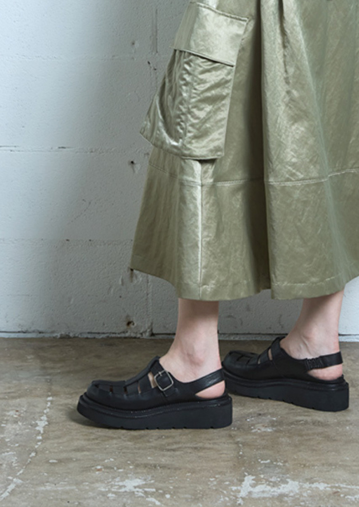 「靴下とも相性抜群のグルカサンダルは今から履ける必需品。厚底ながら軽量設計、なおかつバックストラップは内側ゴム仕様のため、そのままスリップインできるのもうれしいポイントです。マニッシュなスタイリングのハズし役にも◎」。