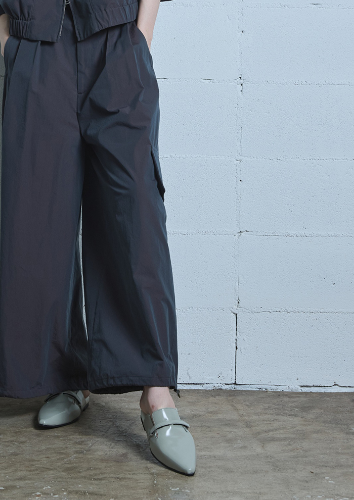 「楽に履けるスリッパタイプなのに、どこかエレガンスで都会的な印象のミュールサンダル。長く伸びた太めのポインテッドトウが大人のシルエットをつくり出し、知的なスタイルを実現します」。