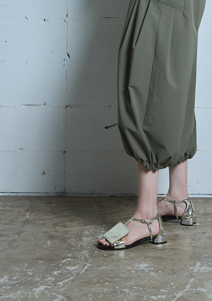 「スクエアモチーフが目を引く主役級のモードサンダル。細めのTストラップを配した大胆なモチーフデザインながら、きれい目な印象のためどんなスタイリングにもなじみます。後ろにはファスナーがあり、着脱のしやすさも◎」。