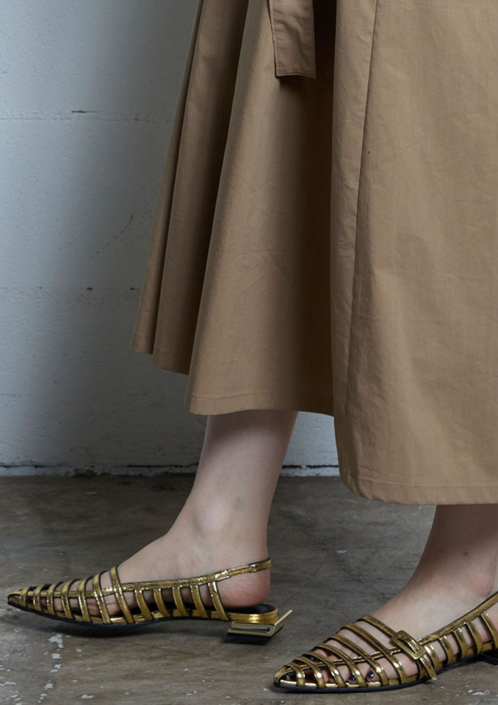 「華奢なストラップが美しく映える、マルチストリングスデザイン。柔らかな山羊革を使用し、上品さと大人の抜け感を兼ね備えた一足です。素肌とレザーの絶妙なバランスが、デニムスタイルには軽やかさを、ワンピースにはこなれ感をプラス。シアー系やラメソックスとのコーディネートも新鮮!」