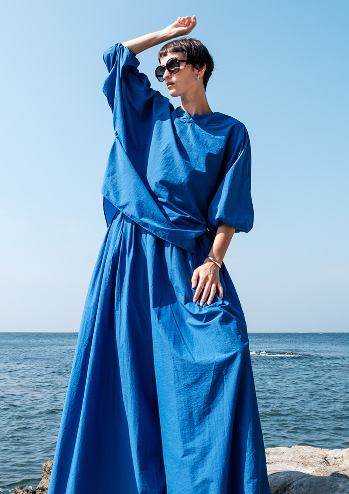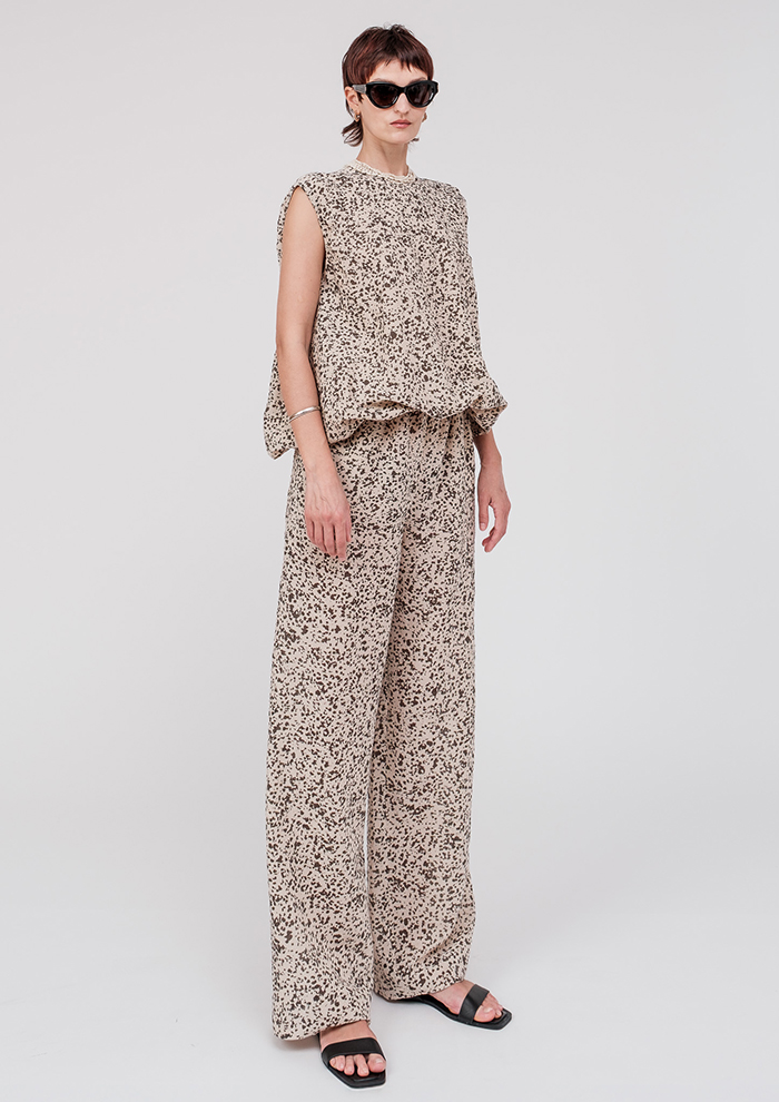 「大地に舞う自然のかけらのような、オーガニックな抽象柄が目を引くオリジナル素材のセットアップ。綿麻生地に塩縮加工を施した凹凸のあるドライタッチ素材を用い、夏らしい軽やかな着心地を叶えています。ブラウスはランダムタックと裾のゴム仕様で立体的なバルーンシルエットに。パンツはミニマルなセミワイドのストレートラインにし、セットでも単品でも洗練されたスタイルを演出します」。