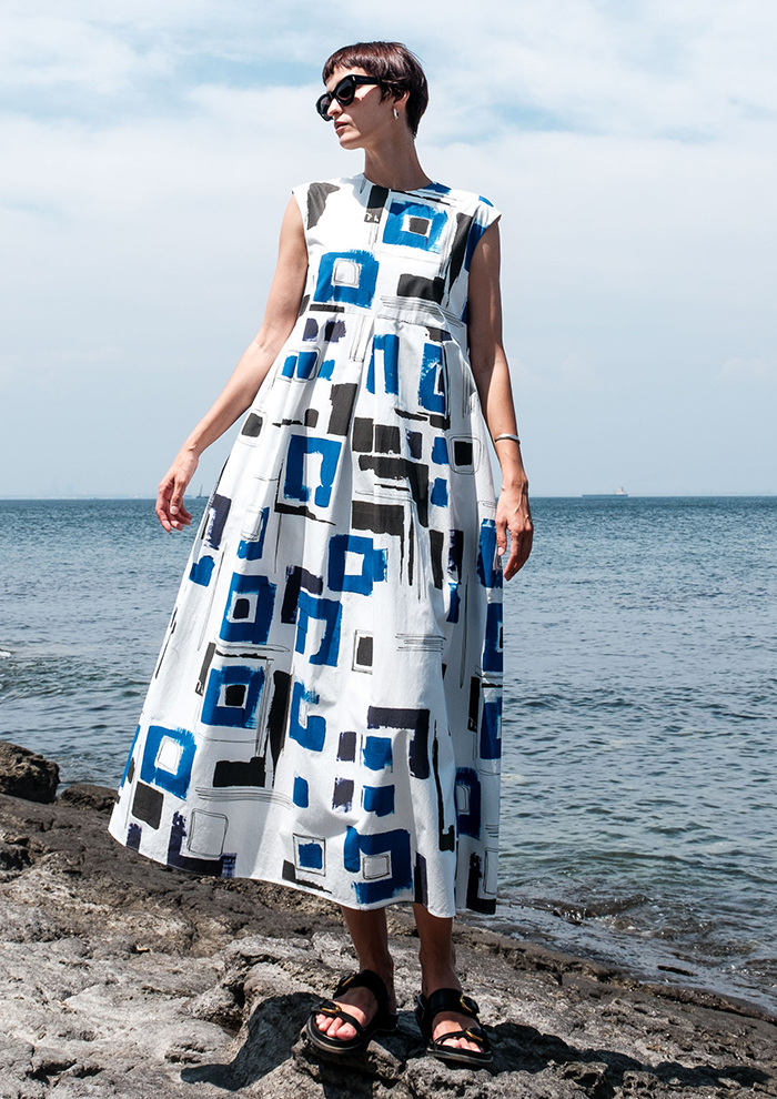「ハリのある国産コットン素材に、手描きタッチのモダンなブロック柄をのせた着映えドレス。大海から広がるリゾートムードを、にじみや筆跡を感じさせるアーティスティックな表現に落とし込みました。コンパクトなトップと、高い切り替え位置からボリューミーに広がるタックスカートの対比が美しい一着」。