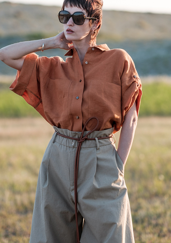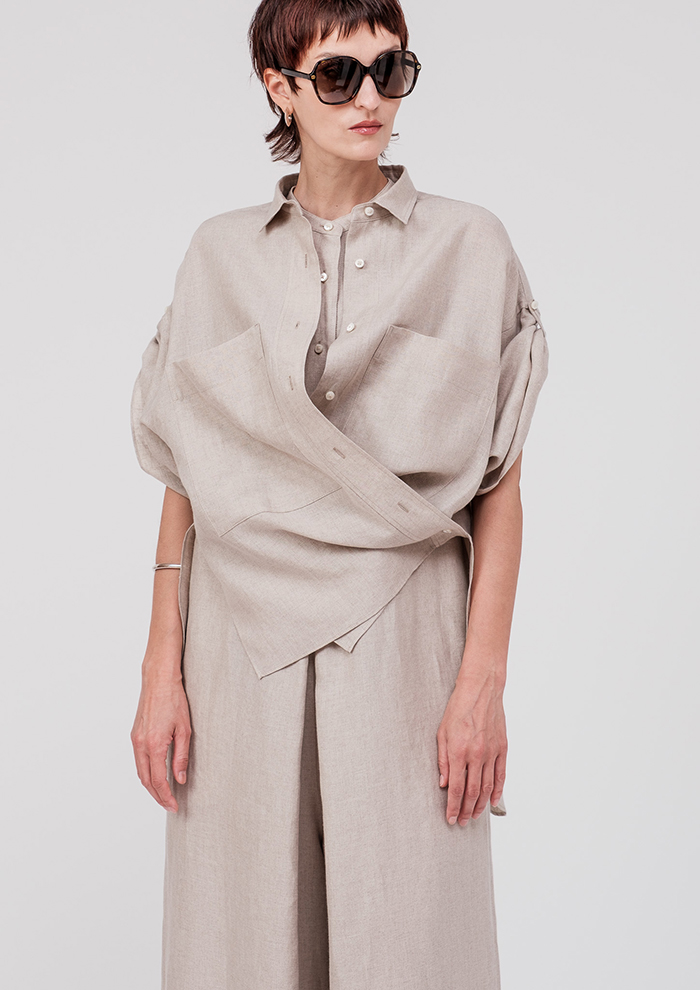 「最高品質のベルギー産リネンを100%使用した、サファリムード漂うショート丈シャツ。発色の美しさと柔らかな風合い、高い耐久性が魅力です。ヒップを包むラウンドカットのバックスタイルがスタイルアップ効果を発揮。裾の内ボタンでカシュクール風にもアレンジ可能です」。